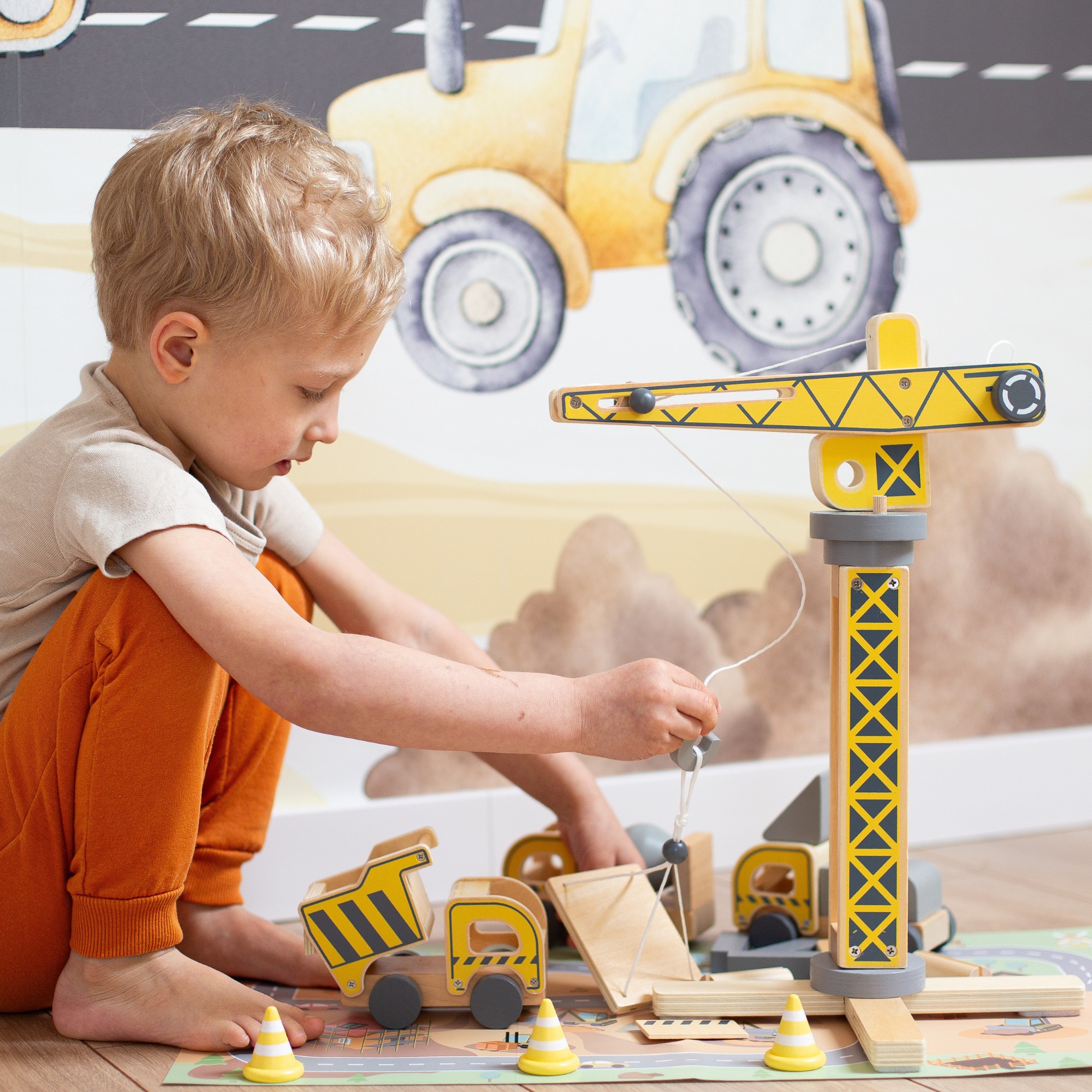 Kļūt par būvkonstruktoru ir daudzu mazuļu sapnis. Koka būvlaukums ar daudziem elementiem iztēli rosinošām rotaļām palīdzēs viņiem īstenot šo sapni. Komplektā, cita starpā, ir milzu celtnis, kas griežas un paceļ celtniecības materiālus uz īpašas platformas. Smalki apstrādātie transportlīdzekļi pārvietojas pa īpašu paliktni, imitējot būvlaukumu. Visu komplektu papildina ceļa aizsprosti un bollardi kā brīdinājums garāmgājējiem.