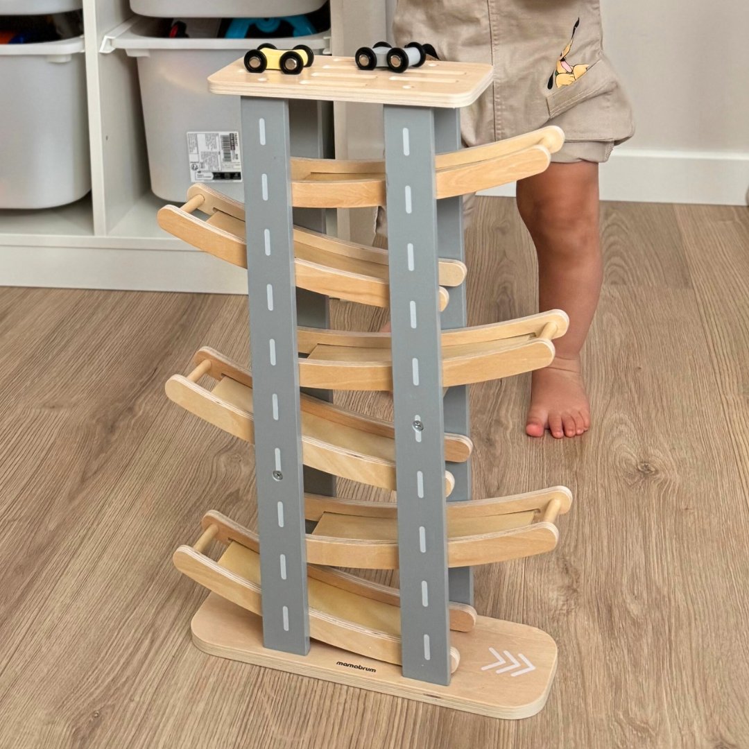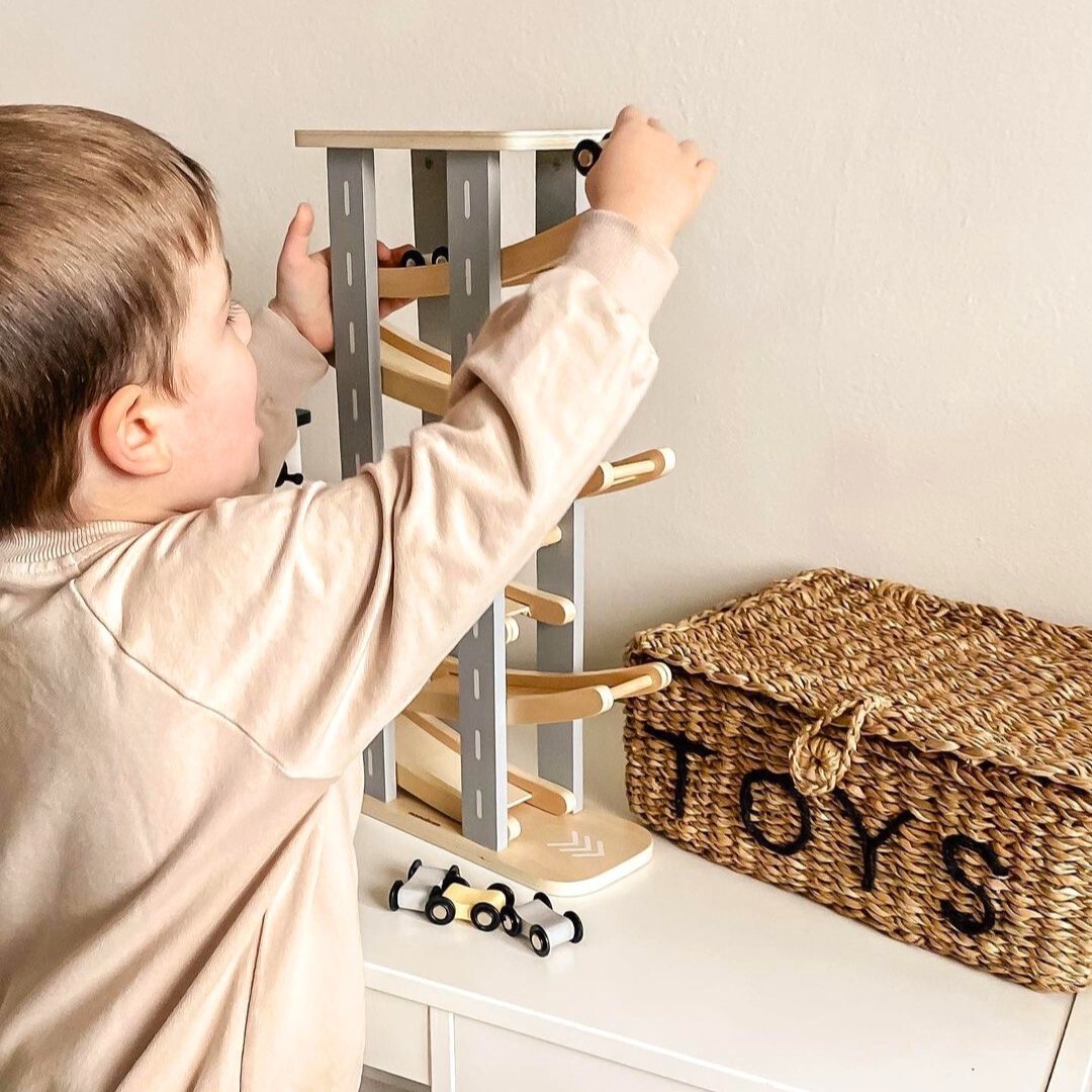 Koka trase ar automašīnām būs lieliska dāvana mazajam auto mīļotājam. Vienkārši izņemiet mašīnu no auto novietnes augšpusē un novietojiet to uz trases augšējā stāva. Pēc tam automašīna brauks lejup, uzkāpjot pa kārtām visos stāvos un iegūstot impulsu braukšanai. Šis skats noteikti iepriecinās jebkuru mazuli. Koka trase ne tikai nodrošina izklaidi, bet arī veicina mazuļu attīstību.