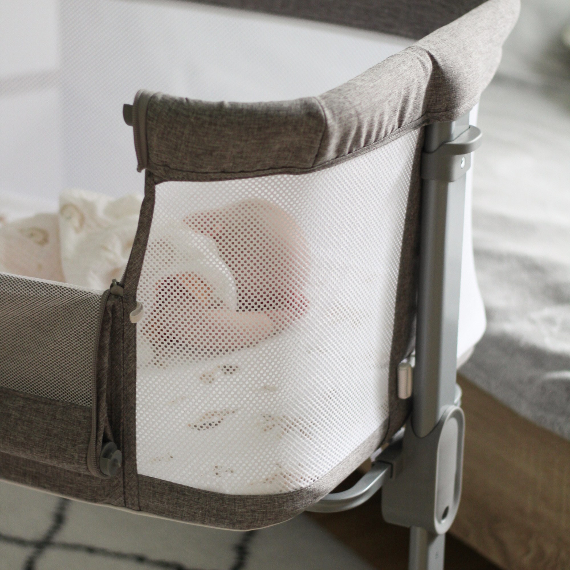 LUNA var droši un ērti savienot ar vecāku gultu, pateicoties īpašām regulējamām stiprinājuma siksnām . Vienkārši novietojiet un nostipriniet bērna gultiņu tieši blakus aprūpētāju gultai.