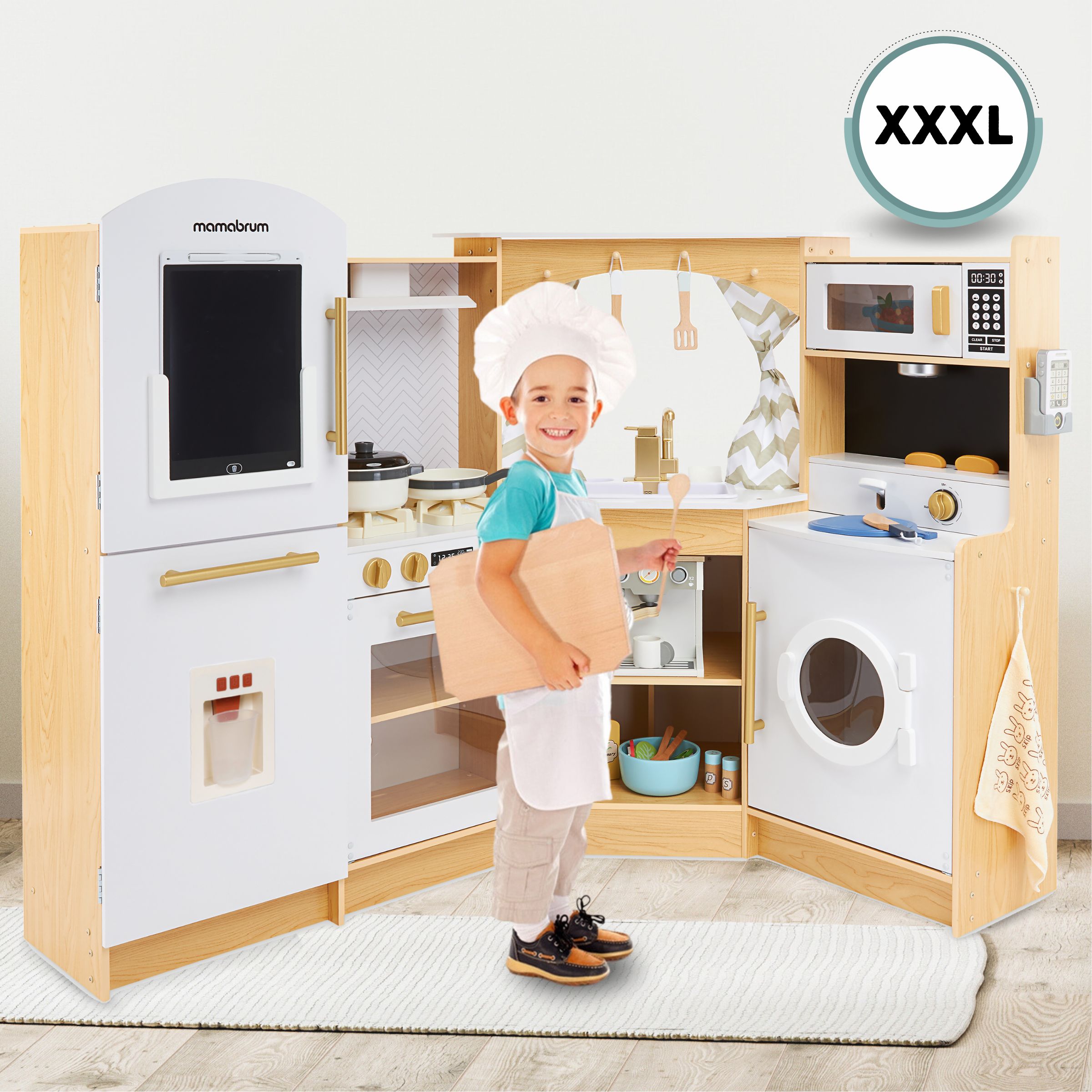 XXXXL liela koka interaktīvā virtuve ar LED apgaismojumu, veļas mašīnu, mikroviļņu krāsns kafijas automātu un augļu un dārzeņu komplektu - 50 elementi