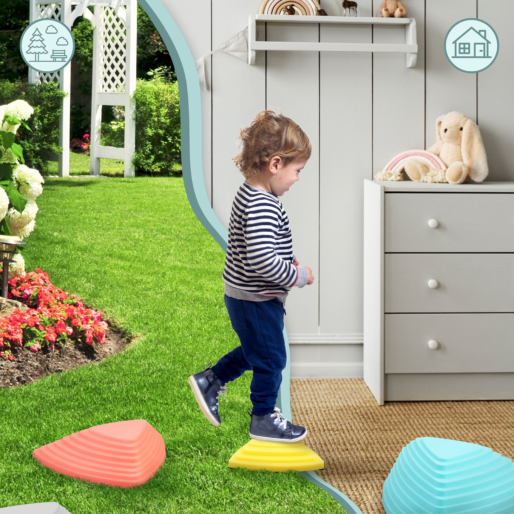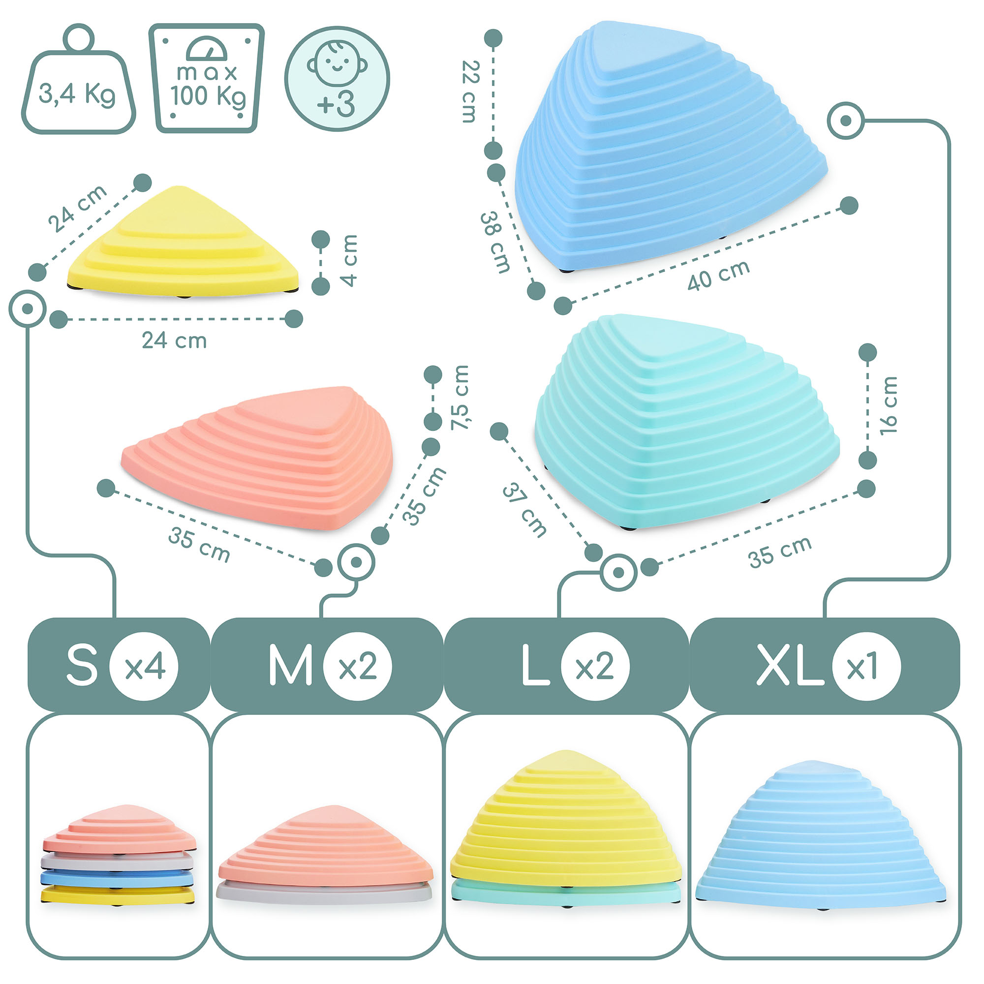 Balansēšanas akmeņu komplektā ir 9 dažāda izmēra un krāsu akmeņi. Vienkārši izkārtojiet tos noteiktā attālumā vienu no otra, lai nodrošinātu mazulim aizraujošu izklaidi. Balansēšana uz vairākiem akmeņiem ir lielisks līdzsvara treniņš un vingrina kustību koordināciju. Šis komplekts ir lieliska izvēle ne tikai mājai, bet arī bērnistabai vai rehabilitācijas telpai.