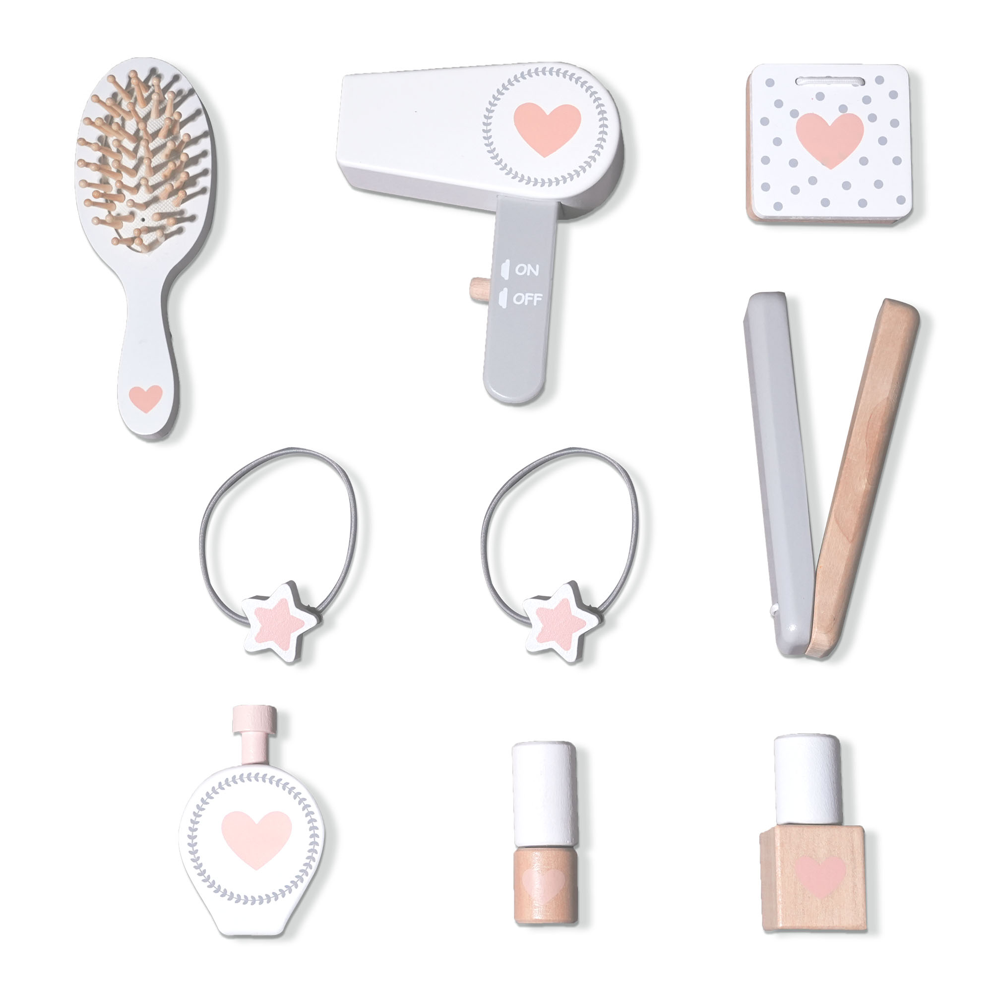 - Komplektā ietilpst līdz 9 piederumiem: matu suka, fēns, acu ēnas, 2 gumijas, matu taisnotājs, smaržas, nagu laka, lūpu krāsa