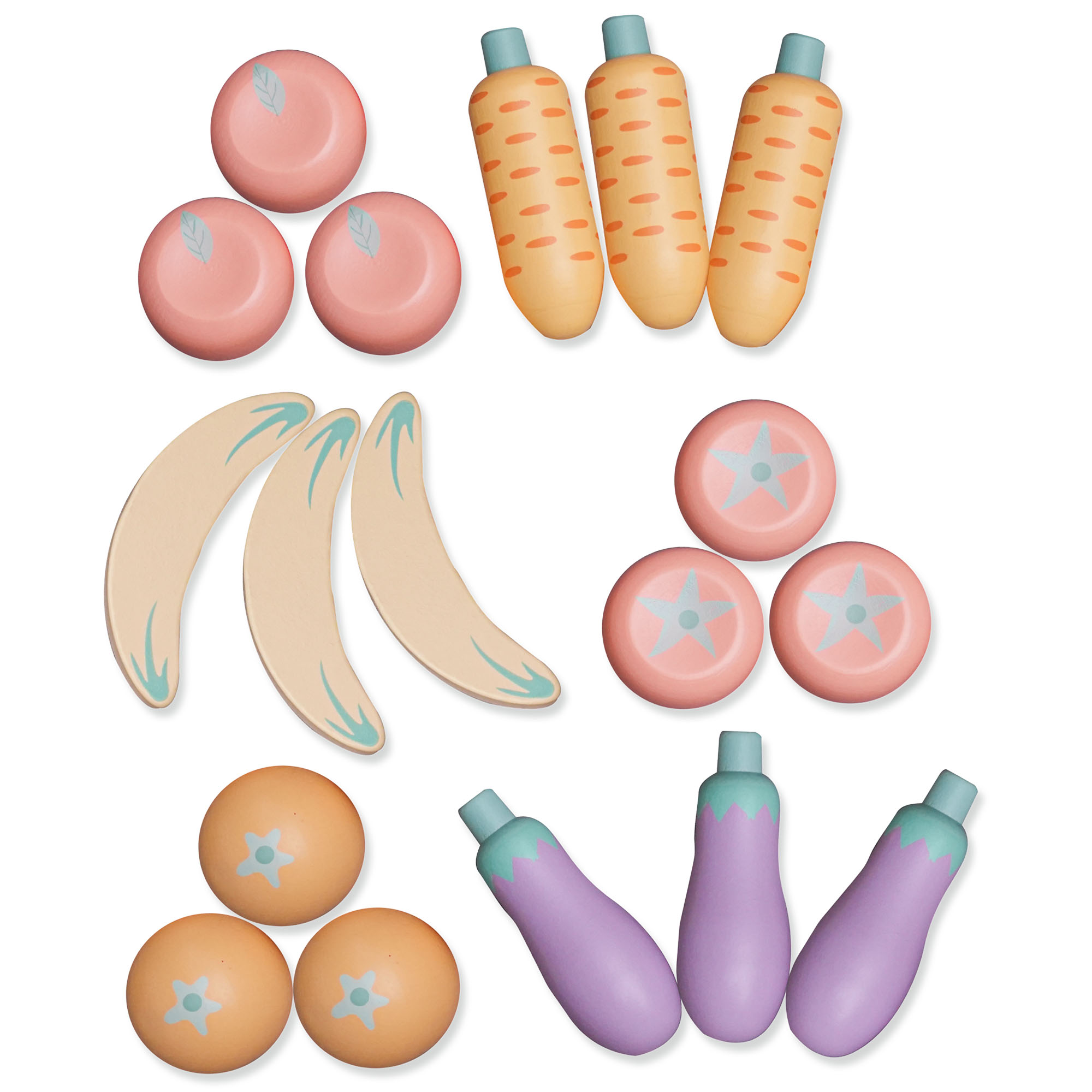 - augļi un dārzeņi (burkāni, baklažāni, banāni, apelsīni, āboli, tomāti) - 18 gab.