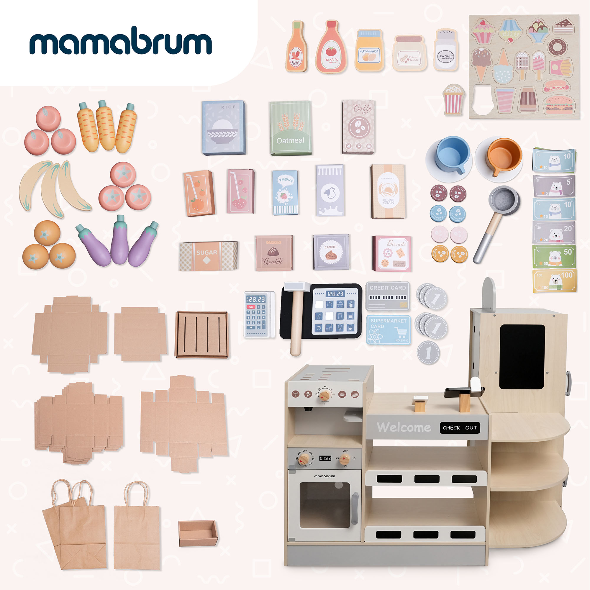 Lielais koka bērnu veikals ar ātrās ēdināšanas bāru ir īsts izklaides centrs mazajiem veikalniekiem un pircējiem. Stūra dizains ar daudziem plauktiem, cepeškrāsni, ledusskapi un kafijas automātu mudina viņus iepazīt dažādas lomas - no baristas līdz veikalniekam. Izturīgā konstrukcija un līdz pat 106 komplektā iekļautie piederumi padara spēli ārkārtīgi reālistisku un attīstošu, mācot organizētību, radošumu un sociālās prasmes.