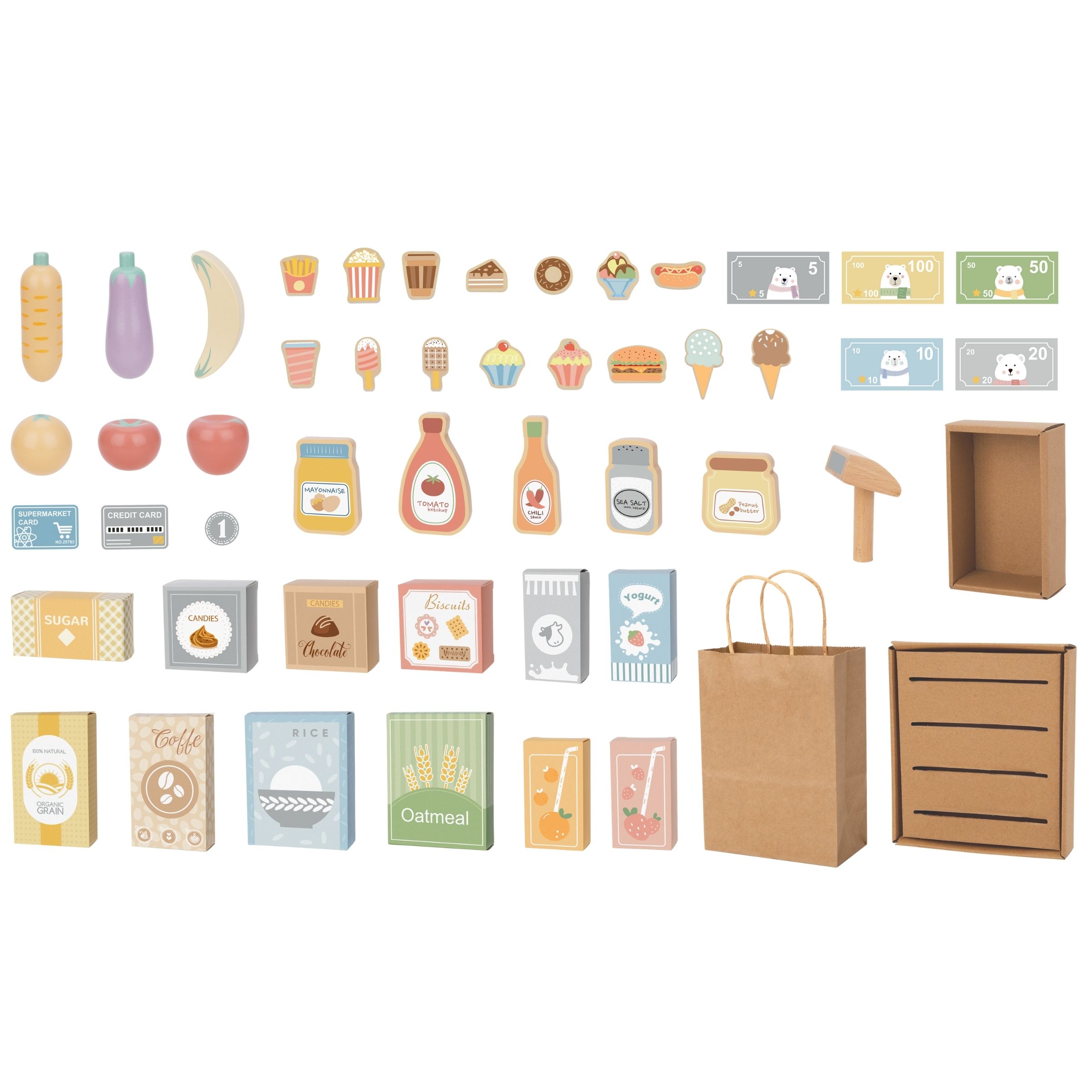Daudzie plaukti preču izvietošanai ļauj mazajam veikalniekam šķirot produktus un ērti tos izkārtot. Pateicoties izturīgajam stendam un plašajam koka stenda aprīkojumam , jūsu bērns var iejusties veikala pārdevēja vai pircēja lomā un nodrošināt unikālu, radošu izklaidi.