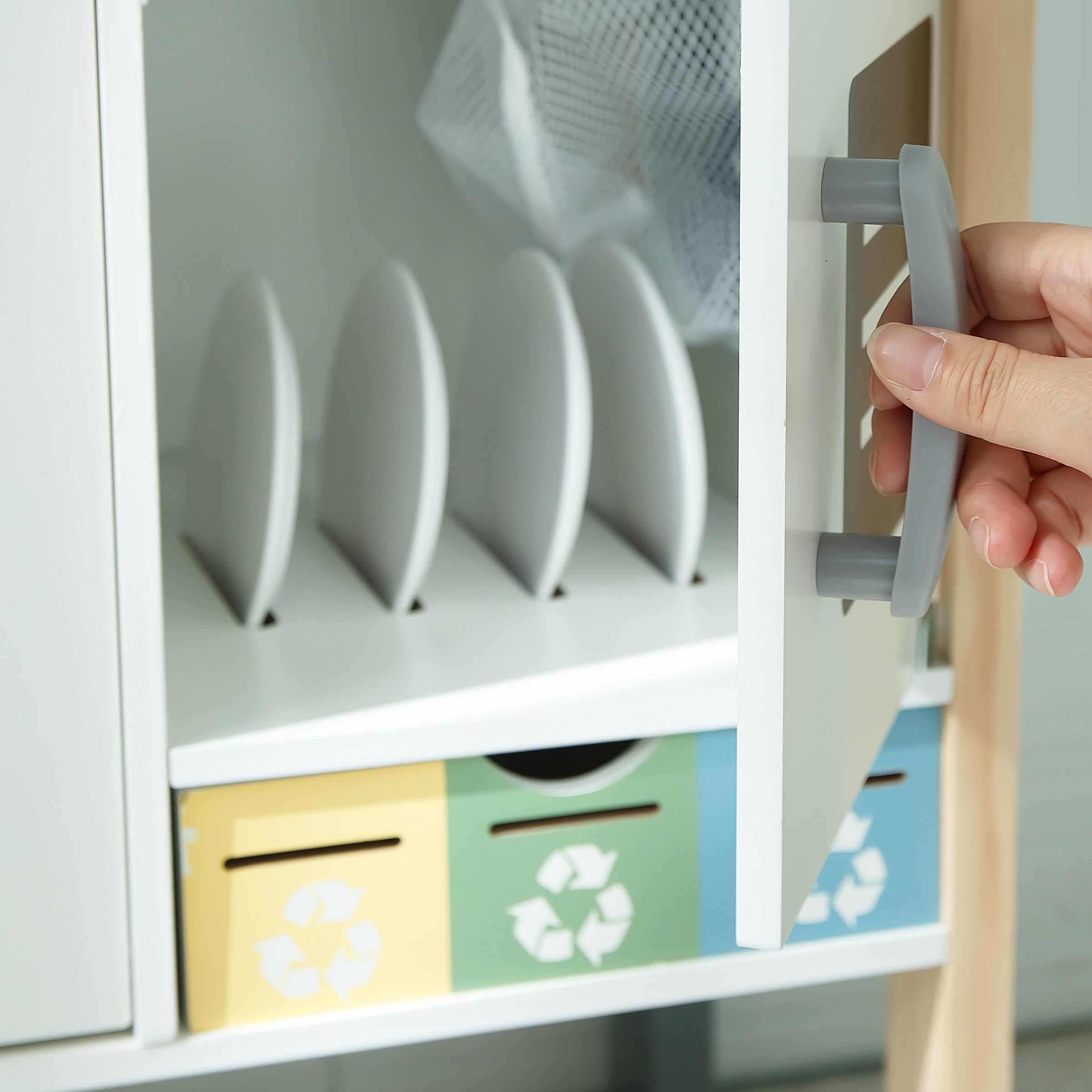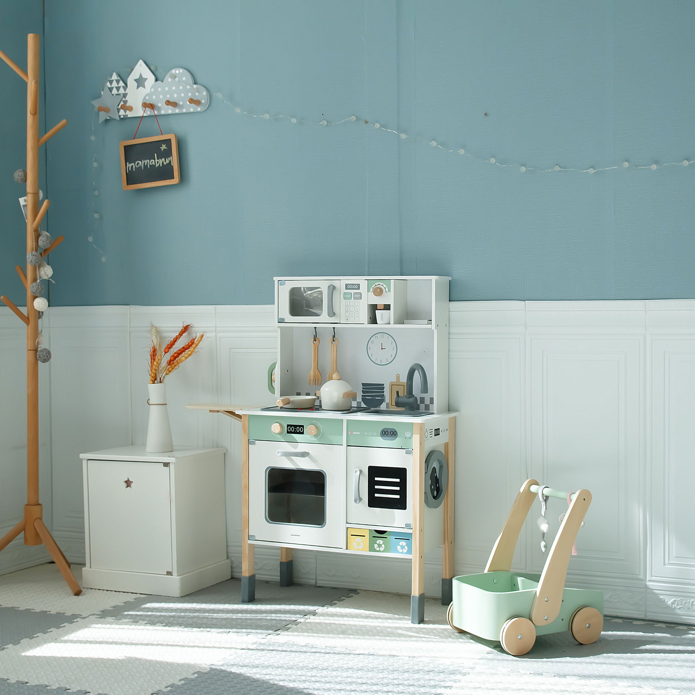 Koka bērnu virtuve ir aprīkota ne tikai ar trauku mazgājamo mašīnu un veļas mazgājamo mašīnu, bet arī ar atkritumu tvertni ar šķirošanas iespējām. Uz tās aizmugurējās sienas ir tāfele, uz kuras bērni var pierakstīt ēdienkarti vai receptes. Komplektu papildina gludināmais dēlis ar gludekli, mikroviļņu krāsns, izlietne un kafijas automāts. Jūs varat būt droši, ka jūsu mazajam nebūs garlaicīgi!