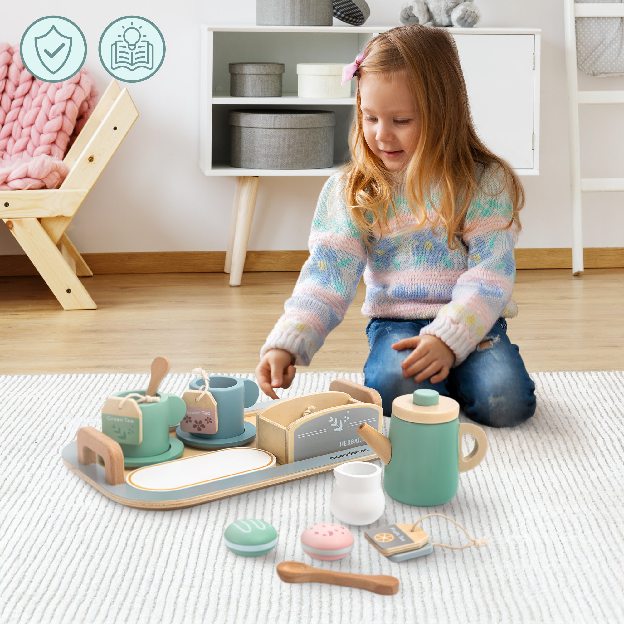 Šis apburošais tējas piederumu komplekts ir kas vairāk nekā tikai rotaļlieta - tas ir līdzeklis, kas atbalsta bērna attīstību dažādos līmeņos. Ar dažādiem elementiem, piemēram, tējkannu, tējkannu, krūzītēm, tējas maisiņiem un paplāti, bērni apgūst lomu spēles, dalīšanos, plānošanu un telpas organizēšanu. Tējas pagatavošanas spēle veicina motorikas, acu un roku koordinācijas, sociālo un komunikācijas prasmju attīstību.