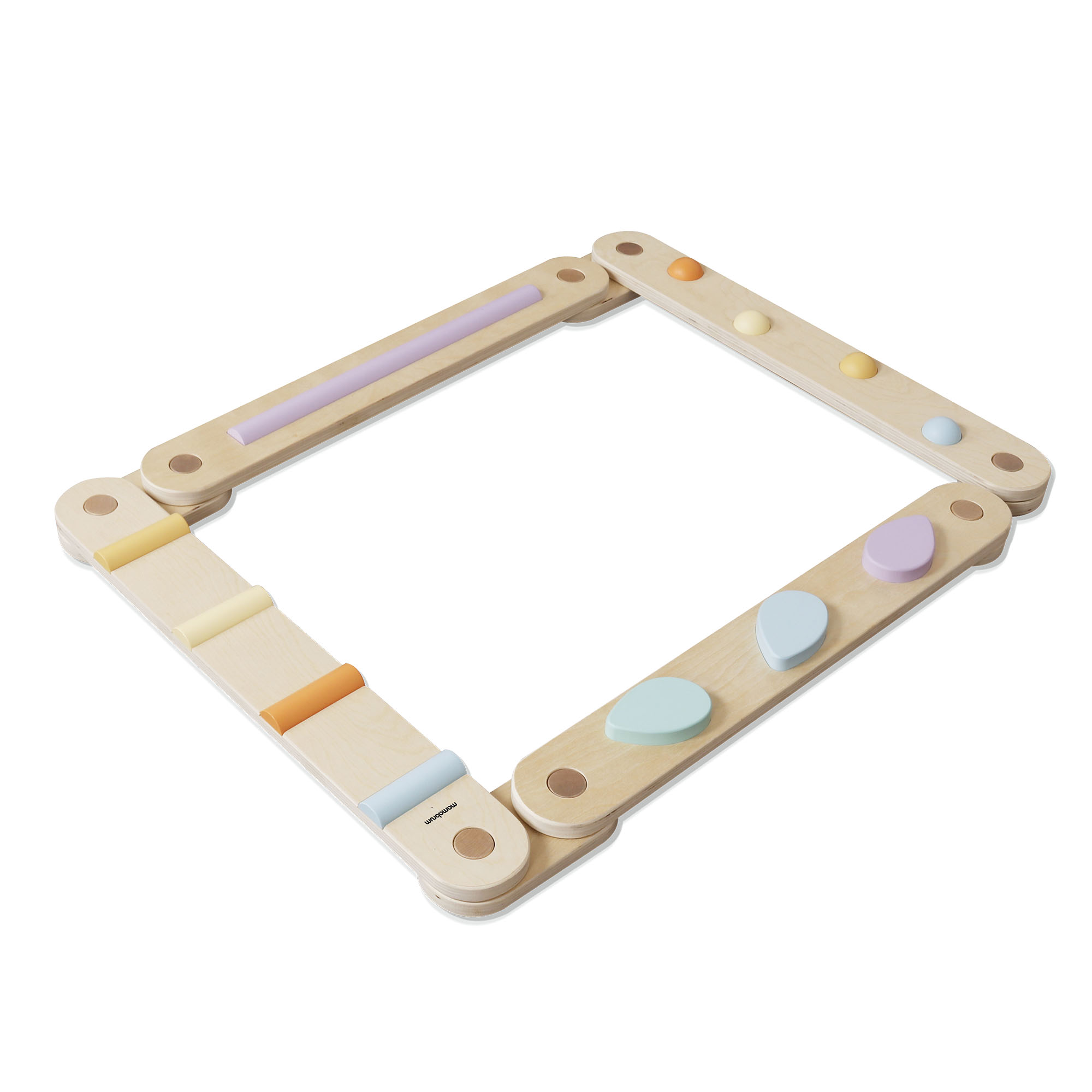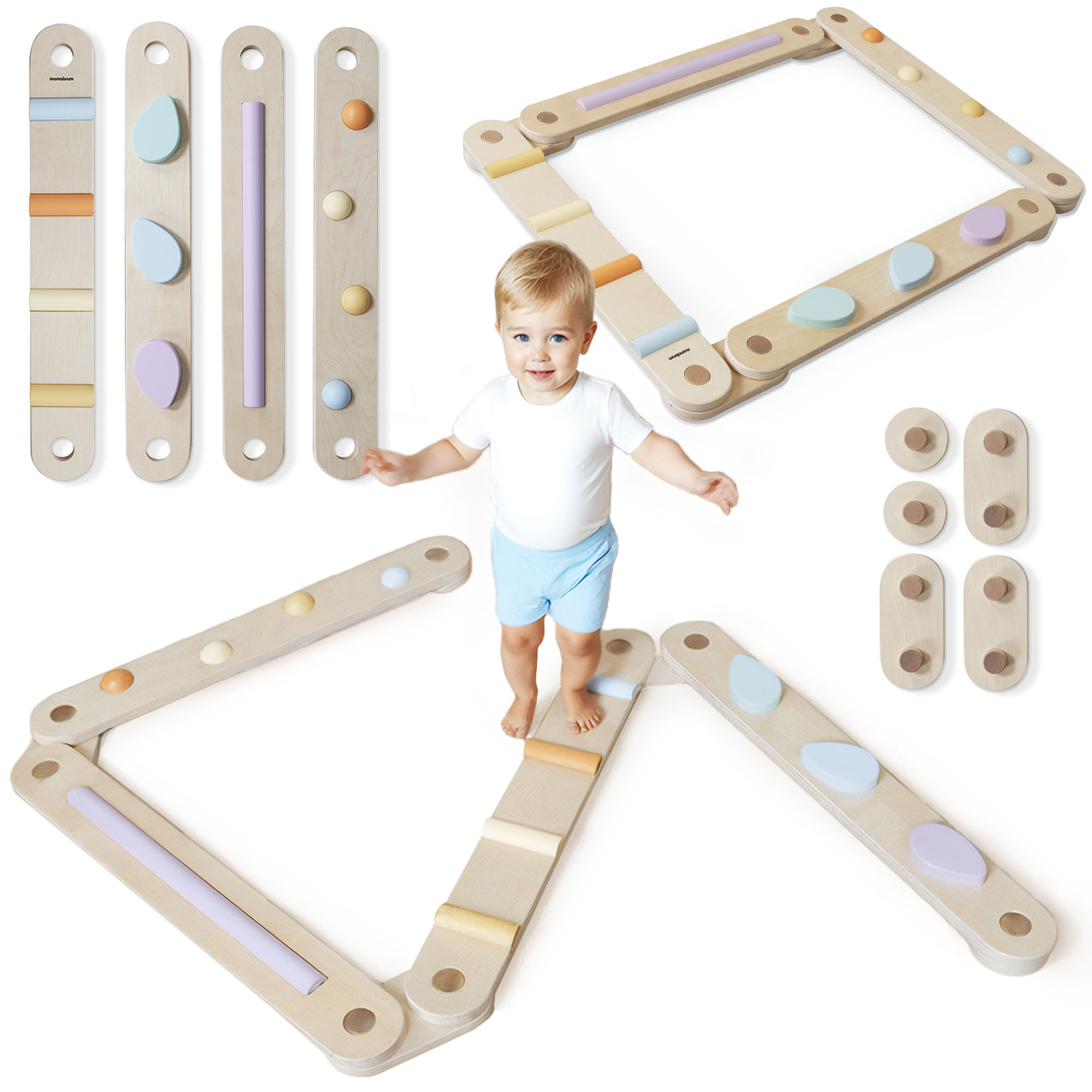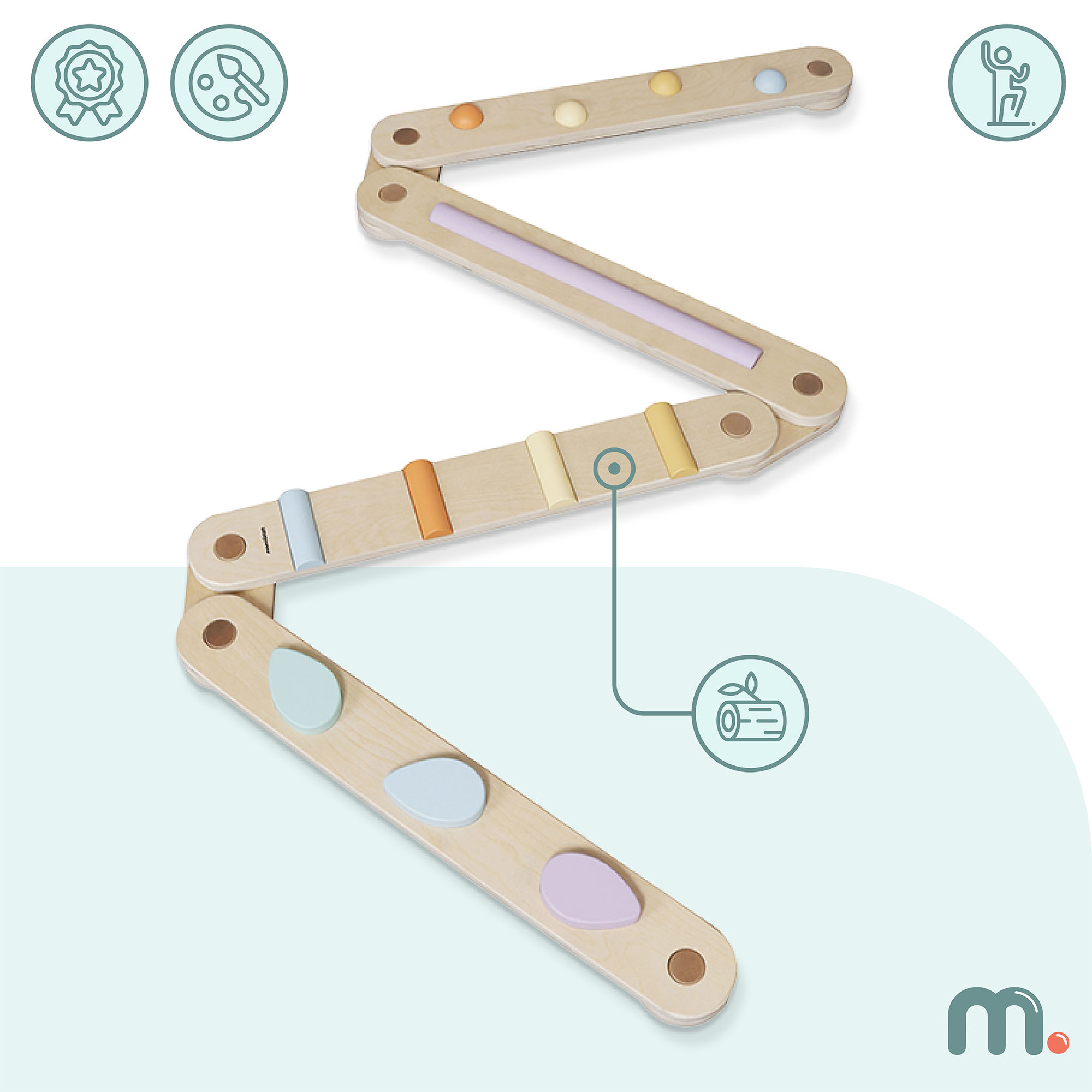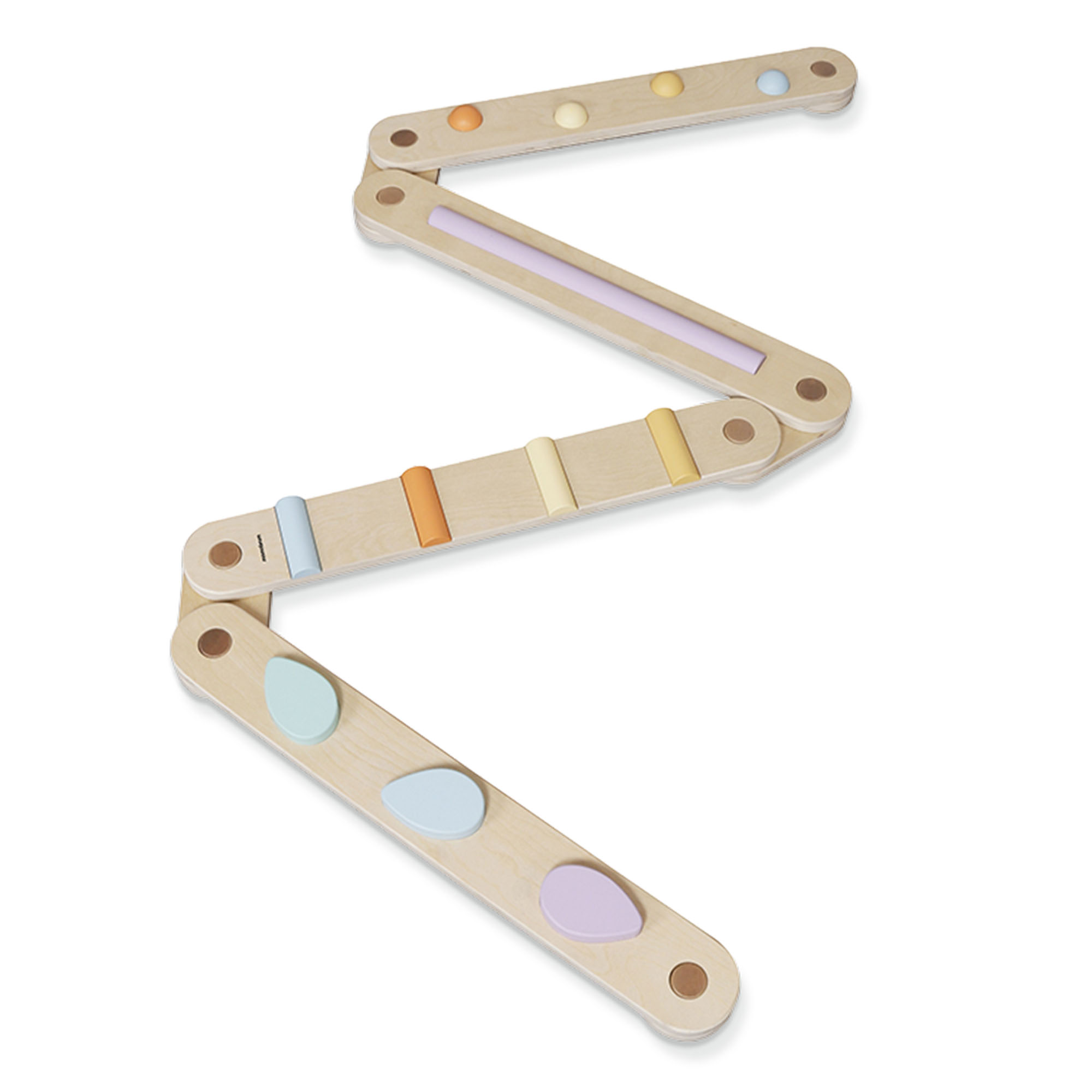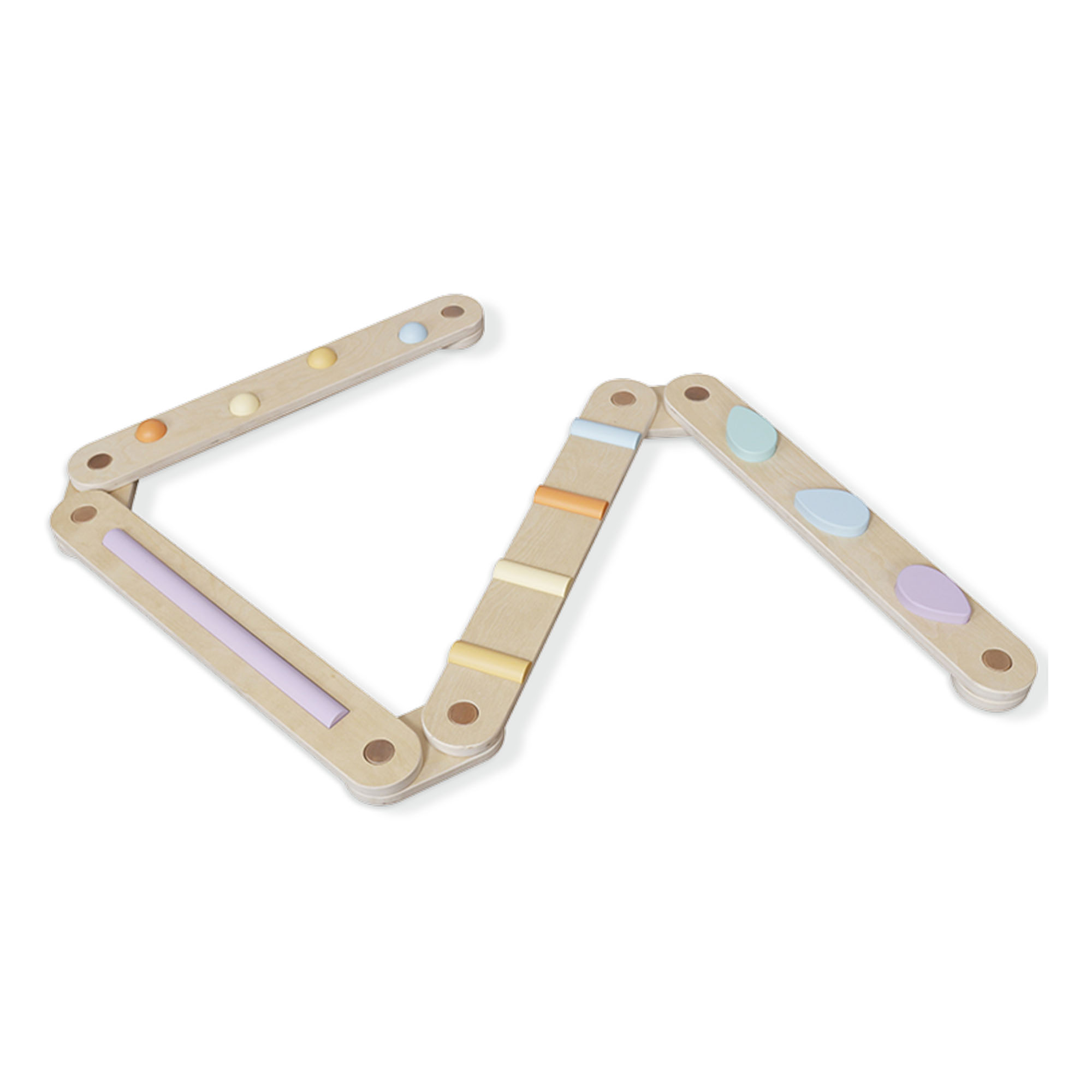 Komplektā ietilpst četras sijas, kas dekorētas ar dažādām krāsainām cilpiņām, un savienotāju komplekts, ar kuru palīdzību var izveidot šķēršļu joslas jebkurā formā. Konstrukcija ir ātra un intuitīva - vienkārši ievietojiet sijas savienotājos, un trase ir gatava! Bērna uzdevums ir soli pa solim pabeigt trasi, kas lieliski attīsta koordināciju, pārliecību un iztēli. Var būvēt atklātas un slēgtas trases - taisnas līnijas, līknes vai kvadrātus.