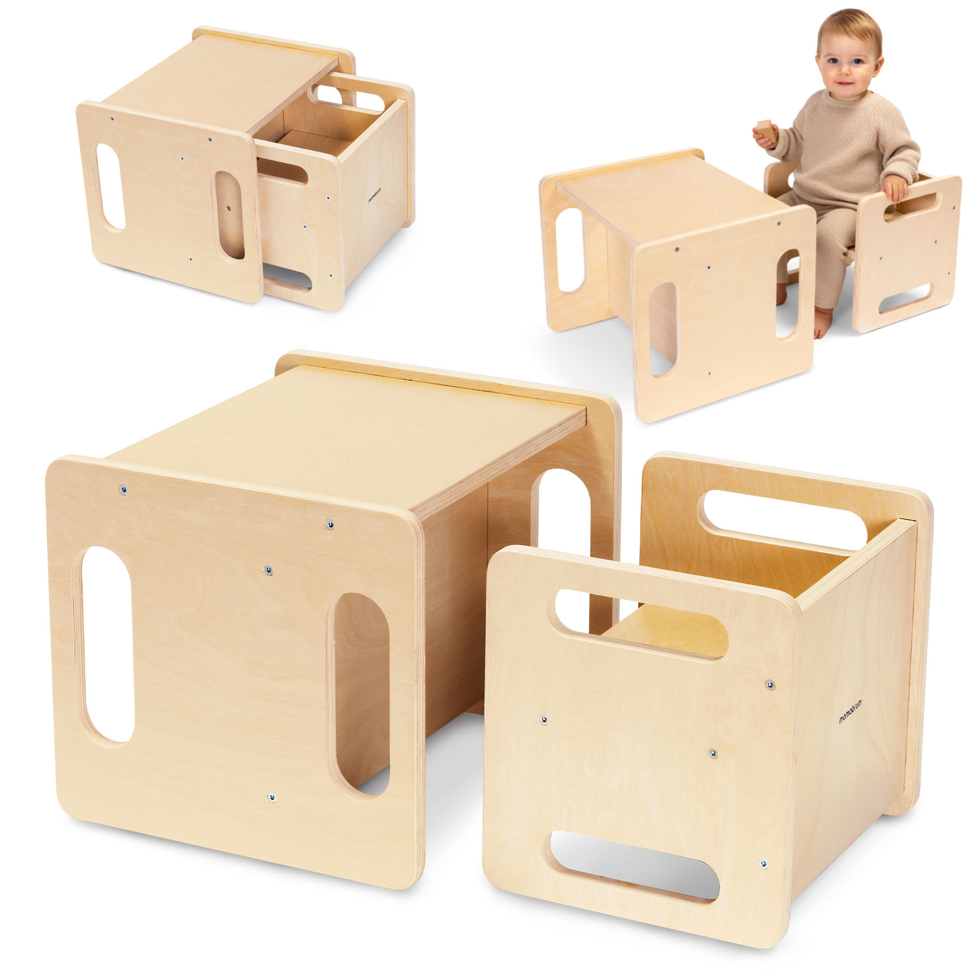 Šis pārdomātais bērnu mēbeļu komplekts apvieno sešus praktiskus pielietojumus , kas pielāgojami jūsu mazuļa vecumam un vajadzībām. Vienkārši apgriežot daļas vietām, galds pārtop no zema galda par augstu galdu, bet krēsls no klasiska sēdekļa – par ērtu ķeblīti. Turklāt abas daļas var izmantot kā atspēriena punktu, veicinot bērna neatkarību saskaņā ar Montessori filozofiju.