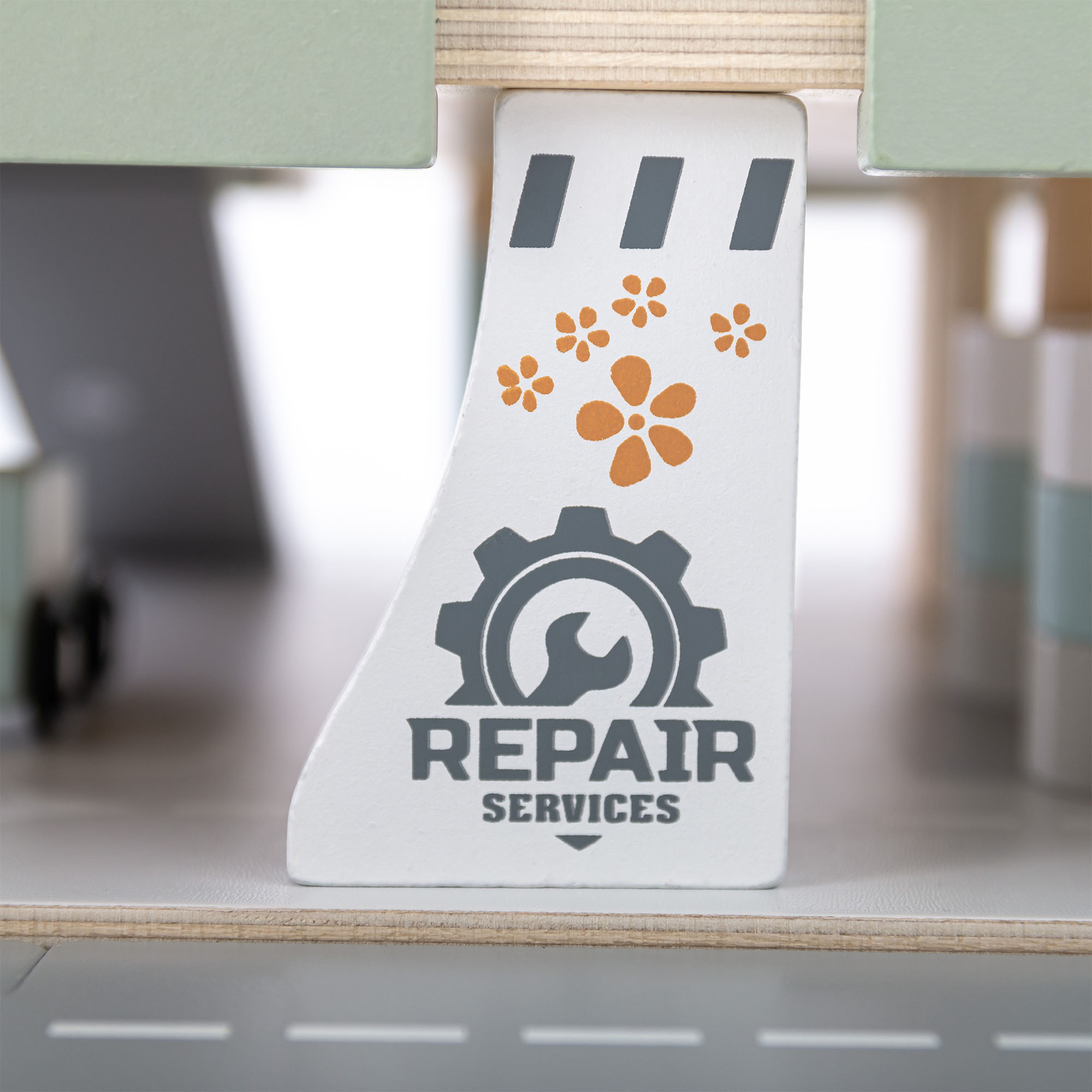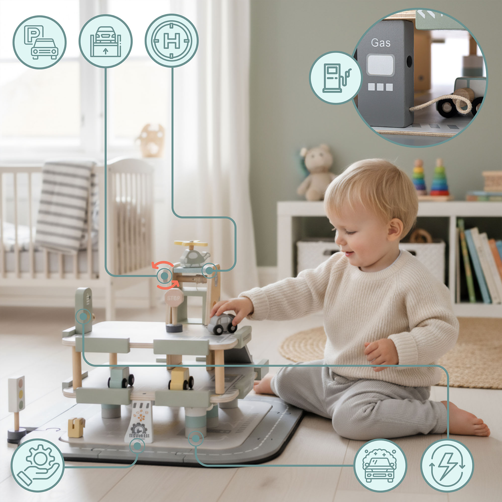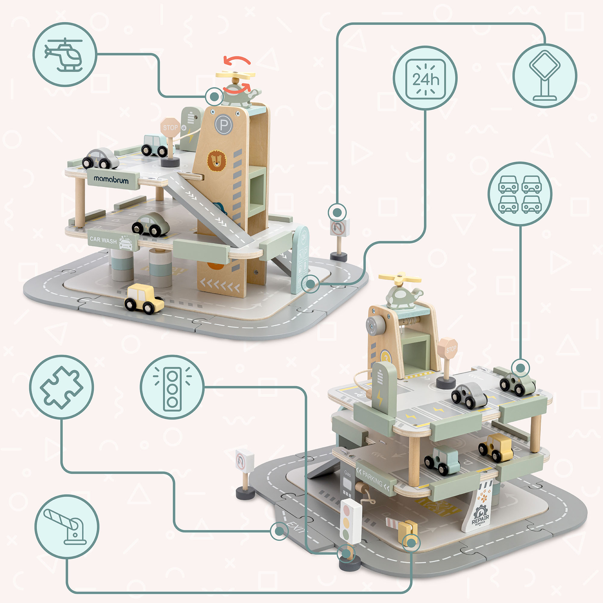 Uzdāvini savam mazajam savu auto centru! Koka trīsstāvu Mamabrum garāža nav tikai autostāvvieta , bet tajā ir arī degvielas uzpildes stacija, automazgātava, remontdarbnīca, elektriskās uzlādes punkts, mobilais auto pacēlājs un helikoptera nosēšanās laukums . Ar plašu aksesuāru klāstu bērni var radīt neskaitāmus rotaļu scenārijus — sākot no ikdienas braucieniem līdz aizraujošiem pilsētas piedzīvojumiem.