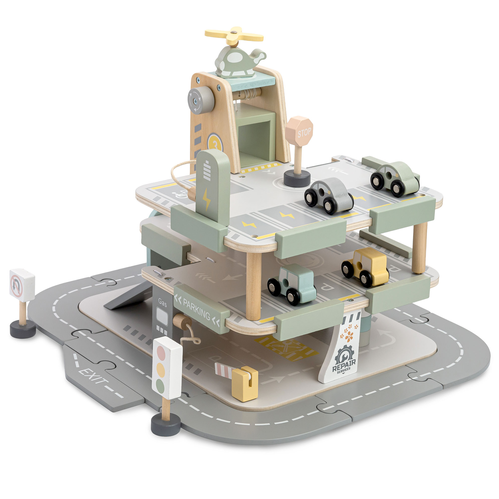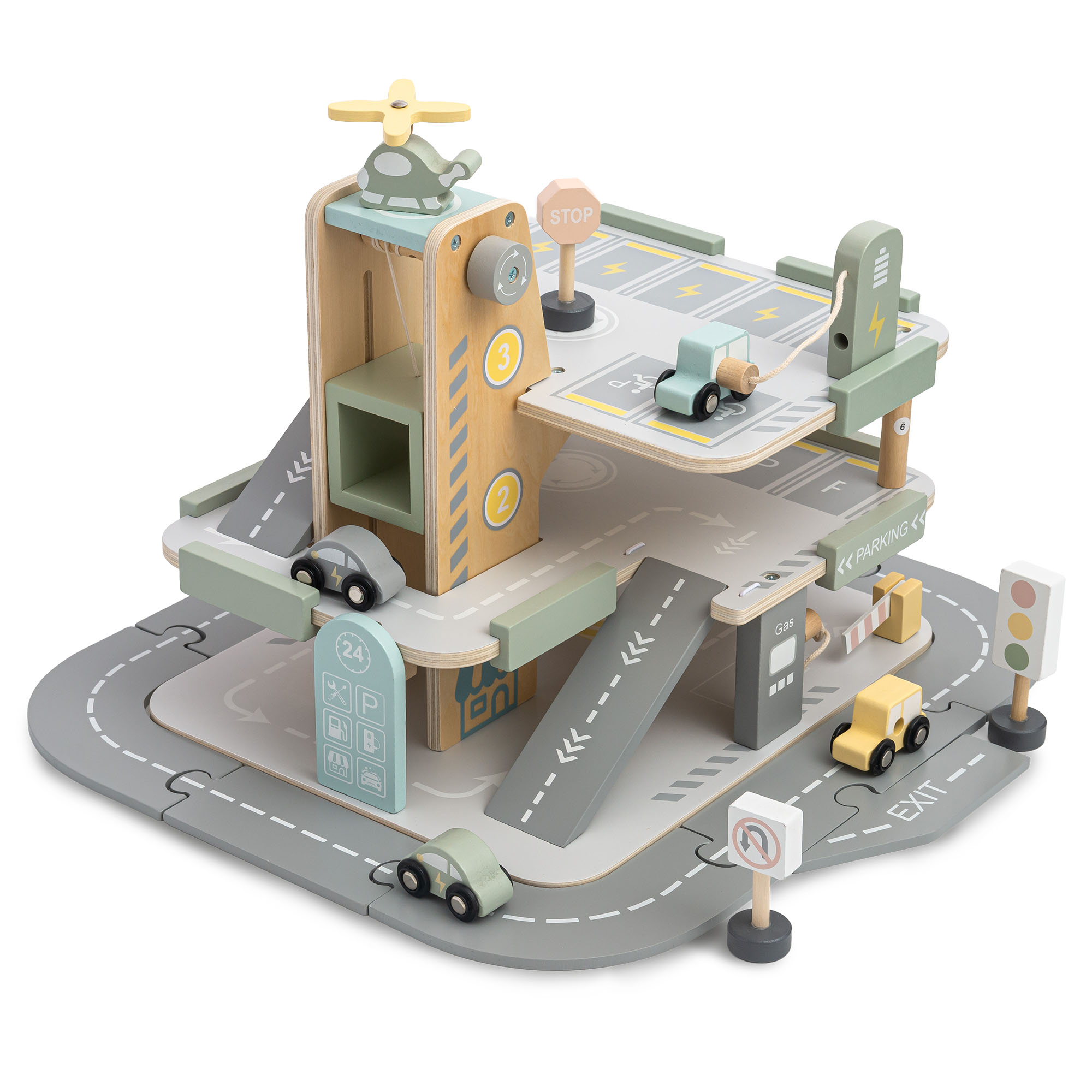 Koka trīsstāvu garāža bērniem ar aksesuāriem – autostāvvieta, degvielas uzpildes stacija, automazgātava, helikopters