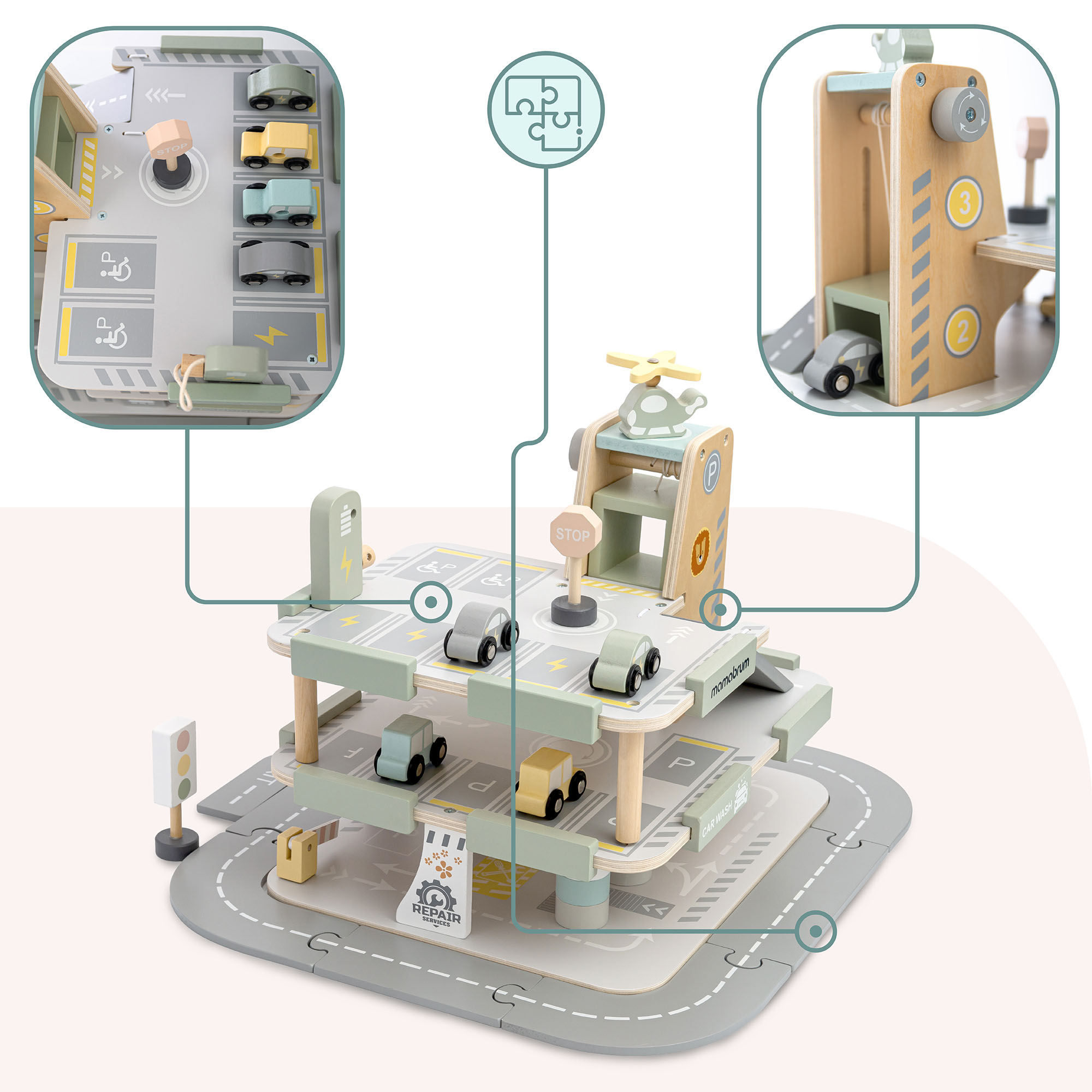 Katrs garāžas līmenis piedāvā jaunas iespējas! Līmeņi ir apzīmēti ar dzīvnieku attēliem: lācis — 1. līmenis, zilonis — 2. līmenis, lauva — 3. līmenis. Automašīnas var izmantot automazgātavu ar kustīgiem veltņiem , uzpildīt degvielu degvielas uzpildes stacijā vai pieslēgties elektriskās uzlādes punktam. Barjera pie ieejas, luksofori un ceļa zīmes piešķir pieredzei reālismu, savukārt helikoptera nosēšanās laukums uz jumta paver durvis uz gaisa piedzīvojumiem. Ceļu puzles ļauj izveidot ielas un piekļuves ceļus, un papildu remonta un apkopes zonas māca transportlīdzekļu apkopi.