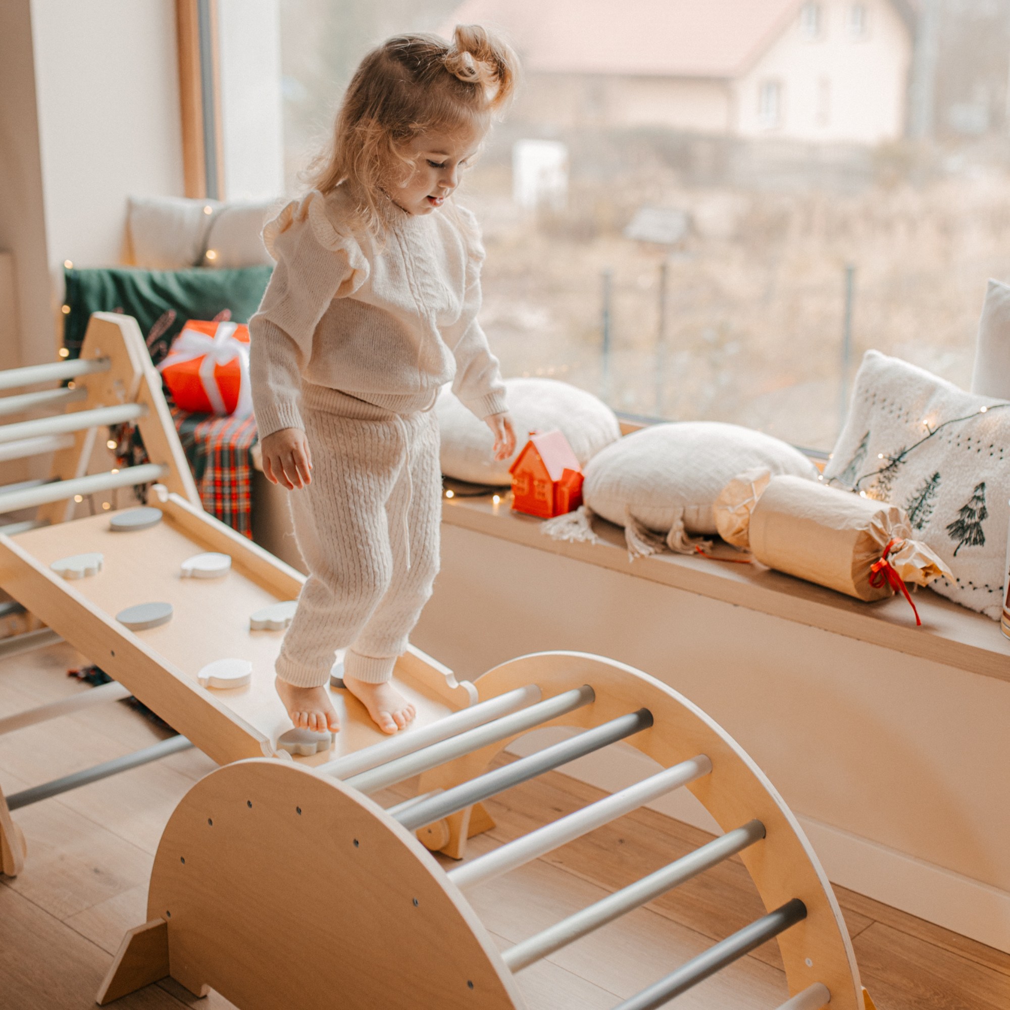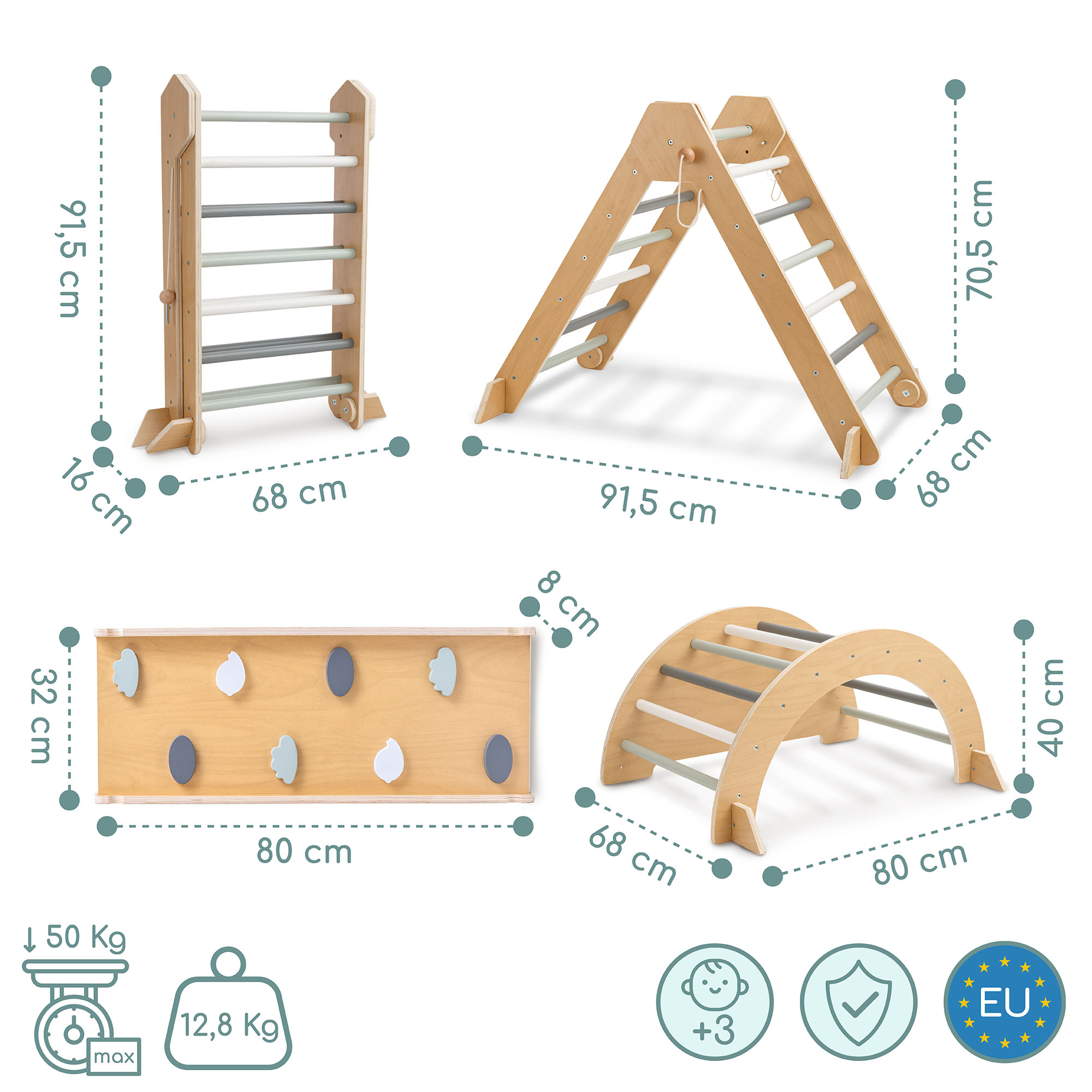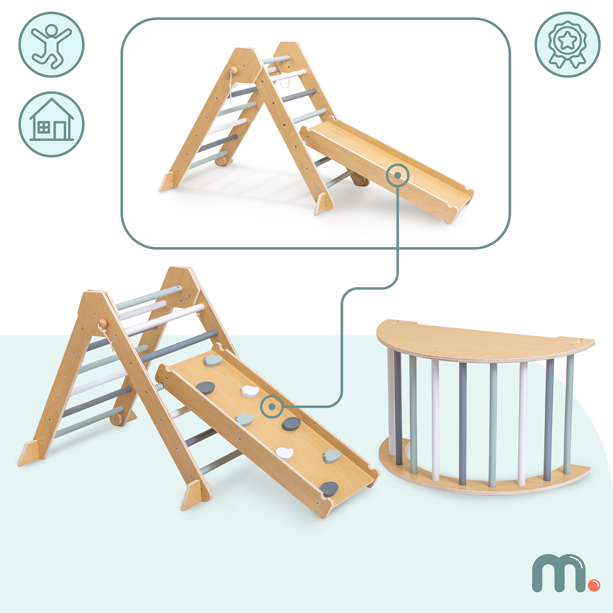 Šis koka rotaļu laukums ir ideāls risinājums vecākiem, kuri vēlas nodrošināt saviem bērniem ikdienas fizisko aktivitāti un jautrību, neizejot no mājām . Rotaļu laukums sastāv no Piklera trīsstūra, kāpšanas arkas/šūpoles un divpusējas rampas, ko var kombinēt dažādās konfigurācijās . Tas veicina kāpšanu, līdzsvara noturēšanu, slīdēšanu un šķēršļu joslu būvēšanu. Šis komplekts atbalsta bērnu rupjo motoriku, koordinācijas un pašapziņas attīstību.