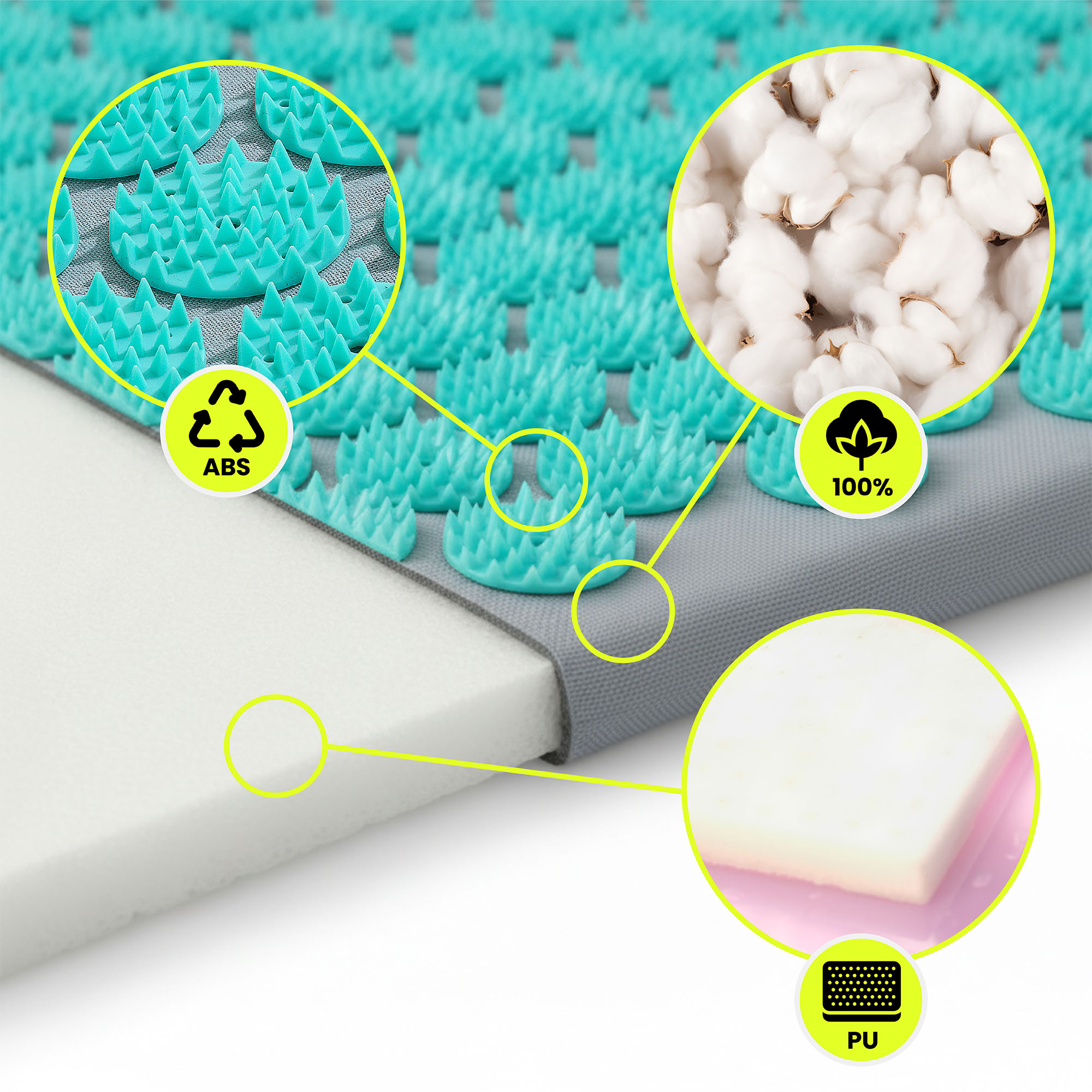 Katrs komplekta elements ir izstrādāts, domājot par komfortu un ikdienas lietošanu. Paklājiņa un spilvenu pārvalki ir izgatavoti no dabīgas 100% kokvilnas , kas ir mīksta pieskārienam un nodrošina patīkamu saskari ar ādu, savukārt iekšpuse ir piepildīta ar elastīgām putām stabilam atbalstam . Izturīgajām plastmasas radzēm ir droši noapaļoti gali , kas nodrošina maigu, bet pamanāmu stimulāciju. Komplektu papildina viegla, nodilumizturīga neilona pārnēsāšanas soma .