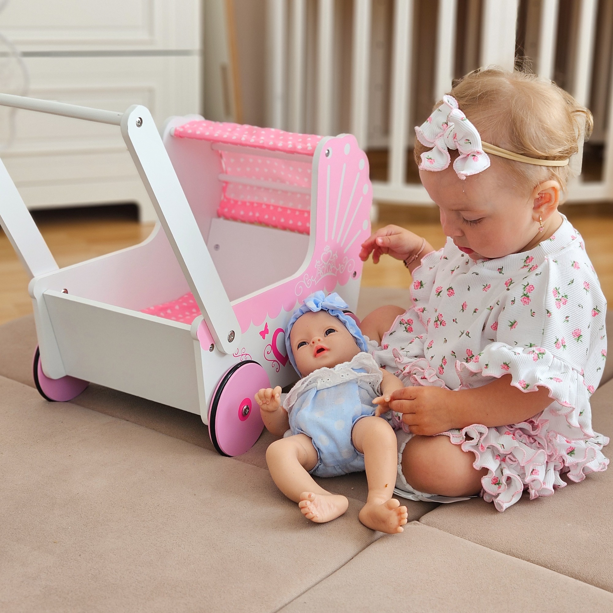 Tagad viņa var ņemt tās līdzi pastaigās šajā burvīgajā bērnu ratiņos. Ar šādu bērnu ratiņu katra mazā princese pārvērtīsies par gādīgu māmiņu, kas rūpējas par savām mīļākajām lellēm.