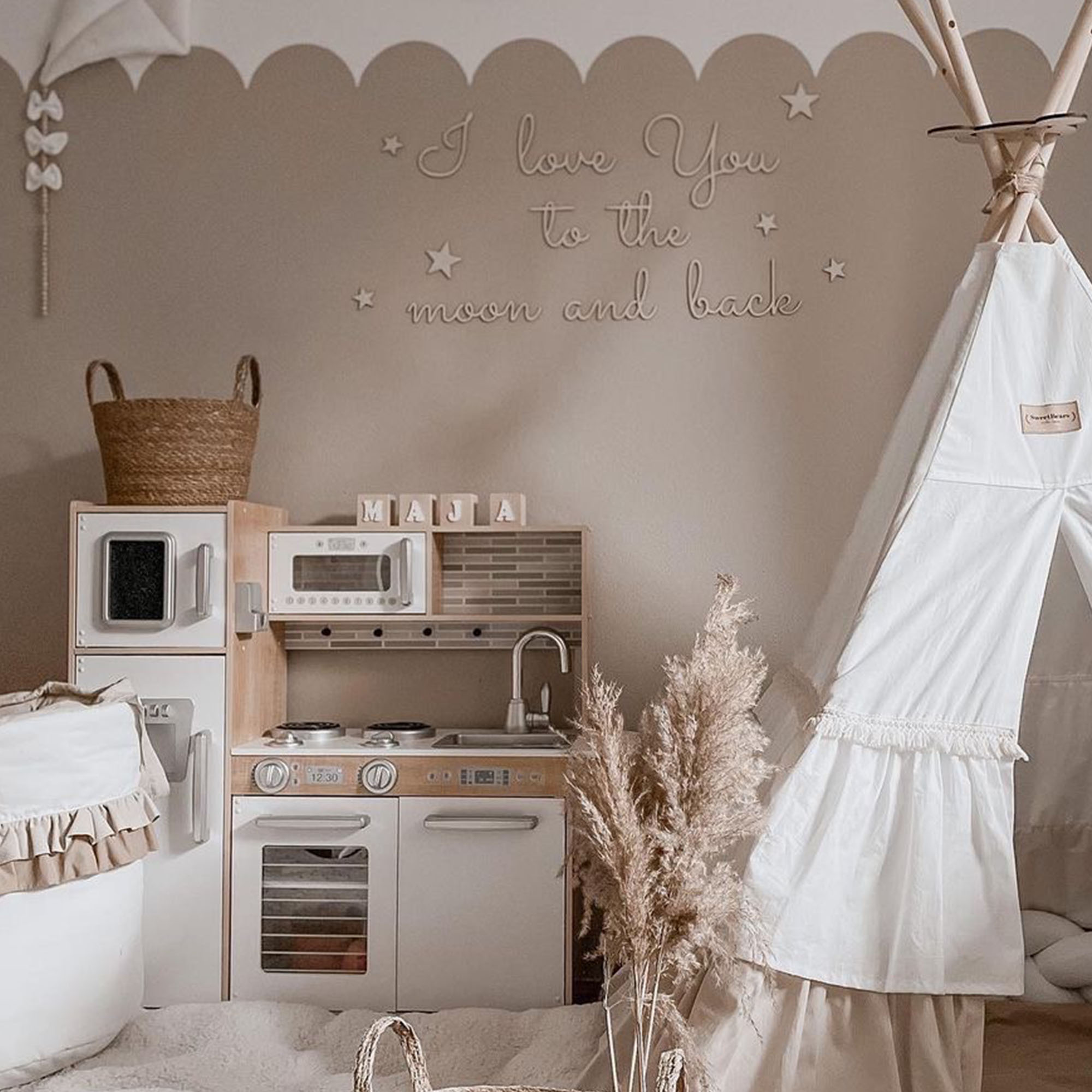 Tai ir maigas krāsas, kas ir piemērotas jebkurai bērna istabai. Virtuves dizains ir dizainīgs un unikāls. Koka darba virsma imitē terrazzo. Kustīgās detaļas ir rūpīgi izgatavotas.