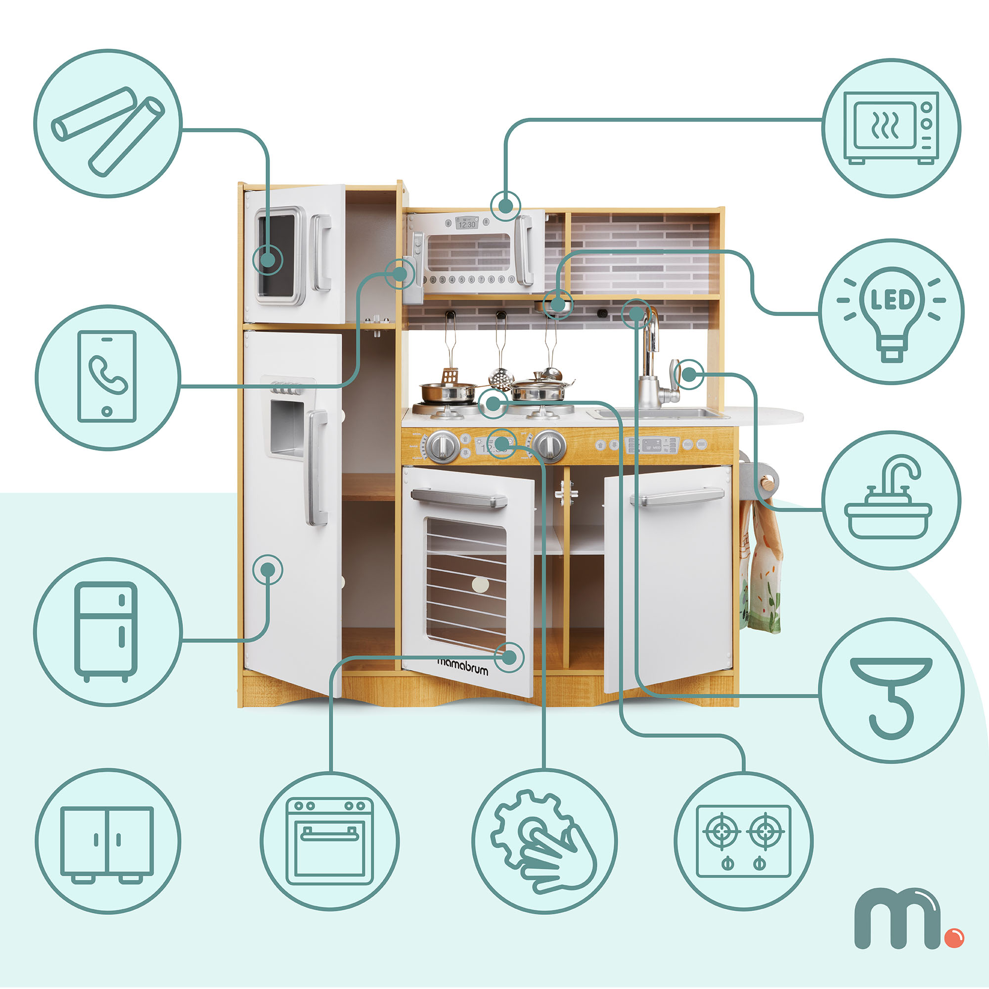 Aksesuāri, piemēram, karote, liekšķere un lāpstiņa, ir precīzi atveidoti no pieaugušo versijas. Virtuve ir izgatavota no koka.