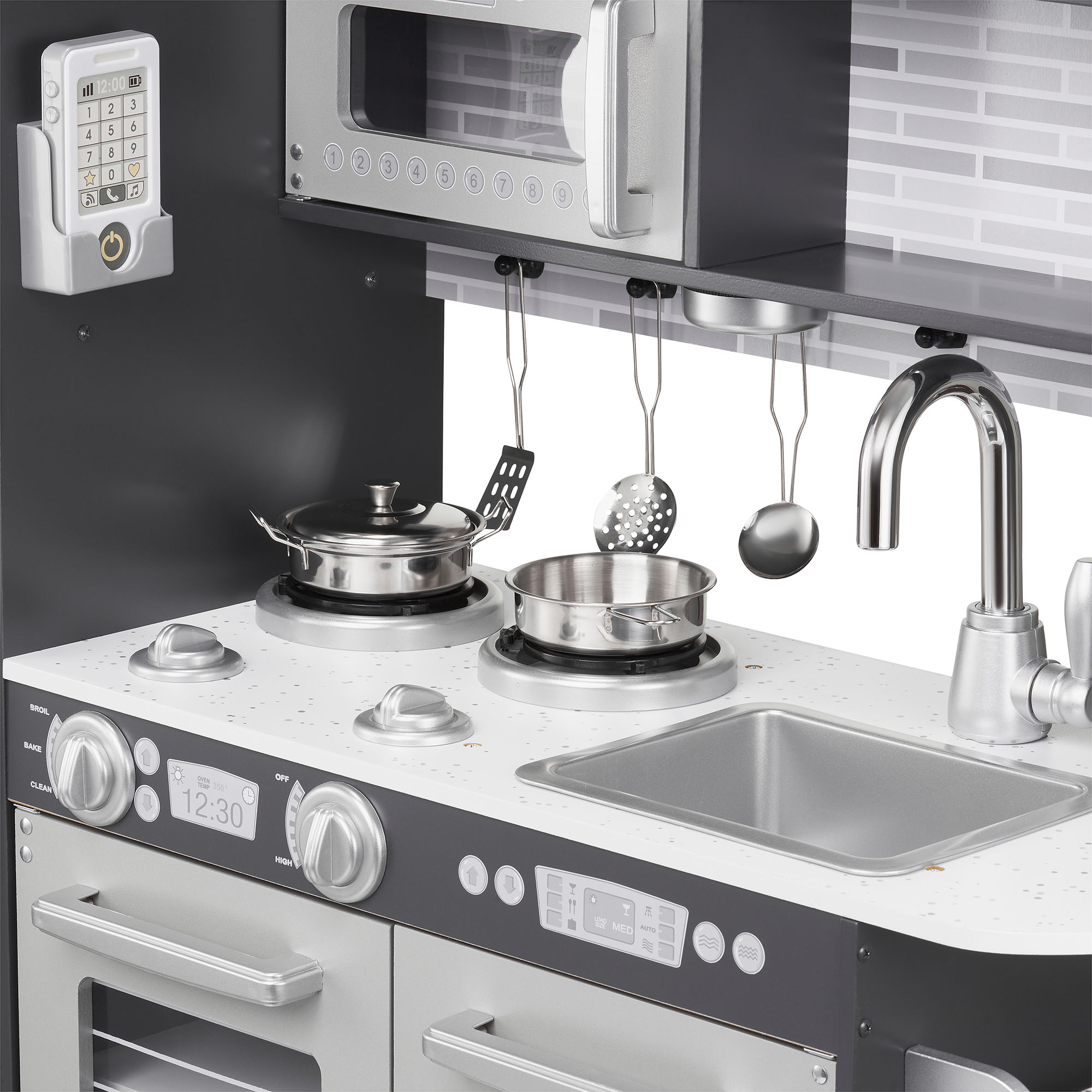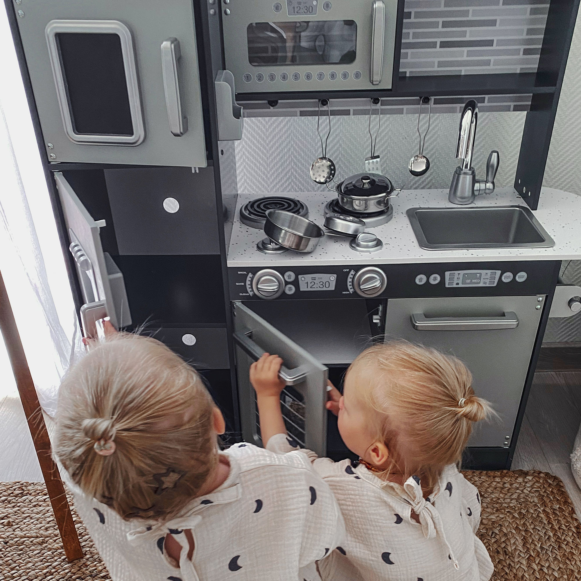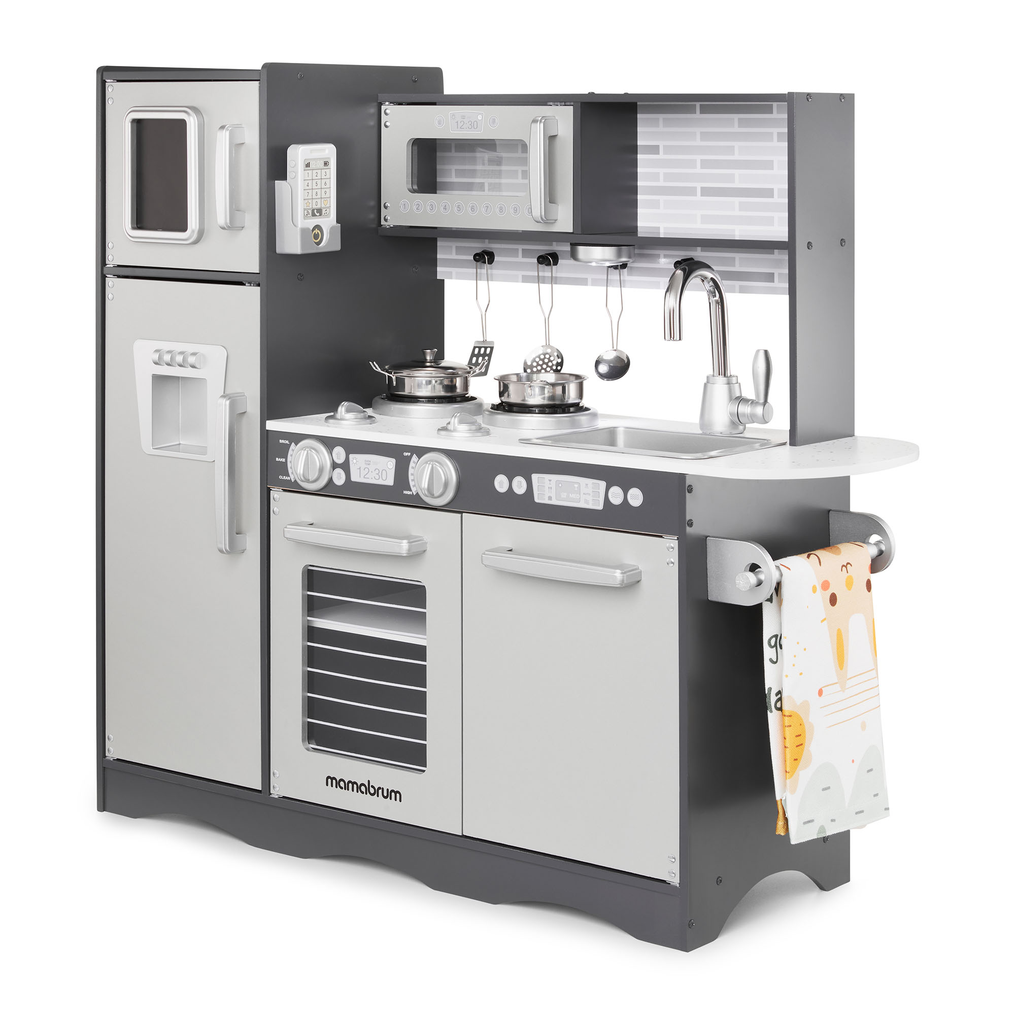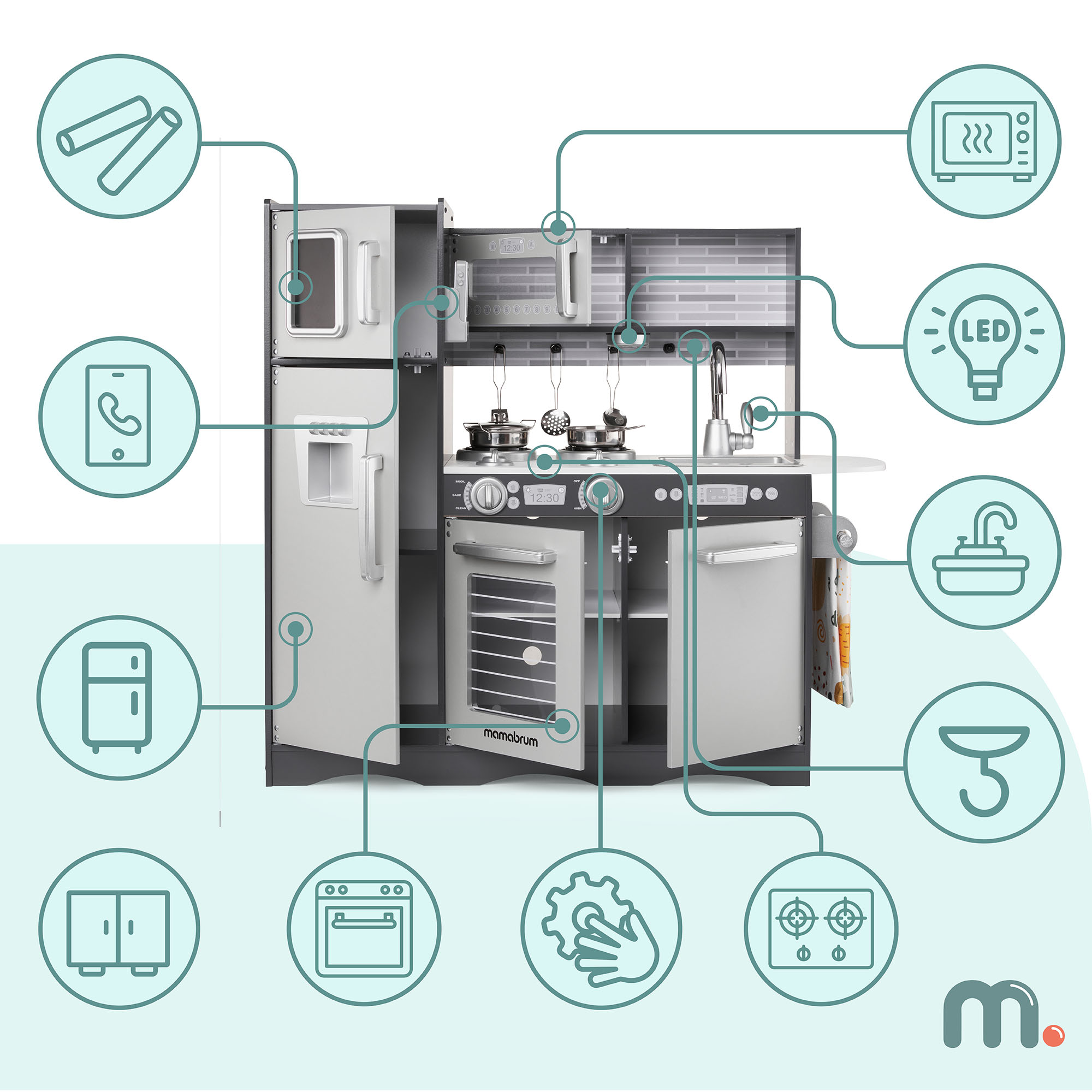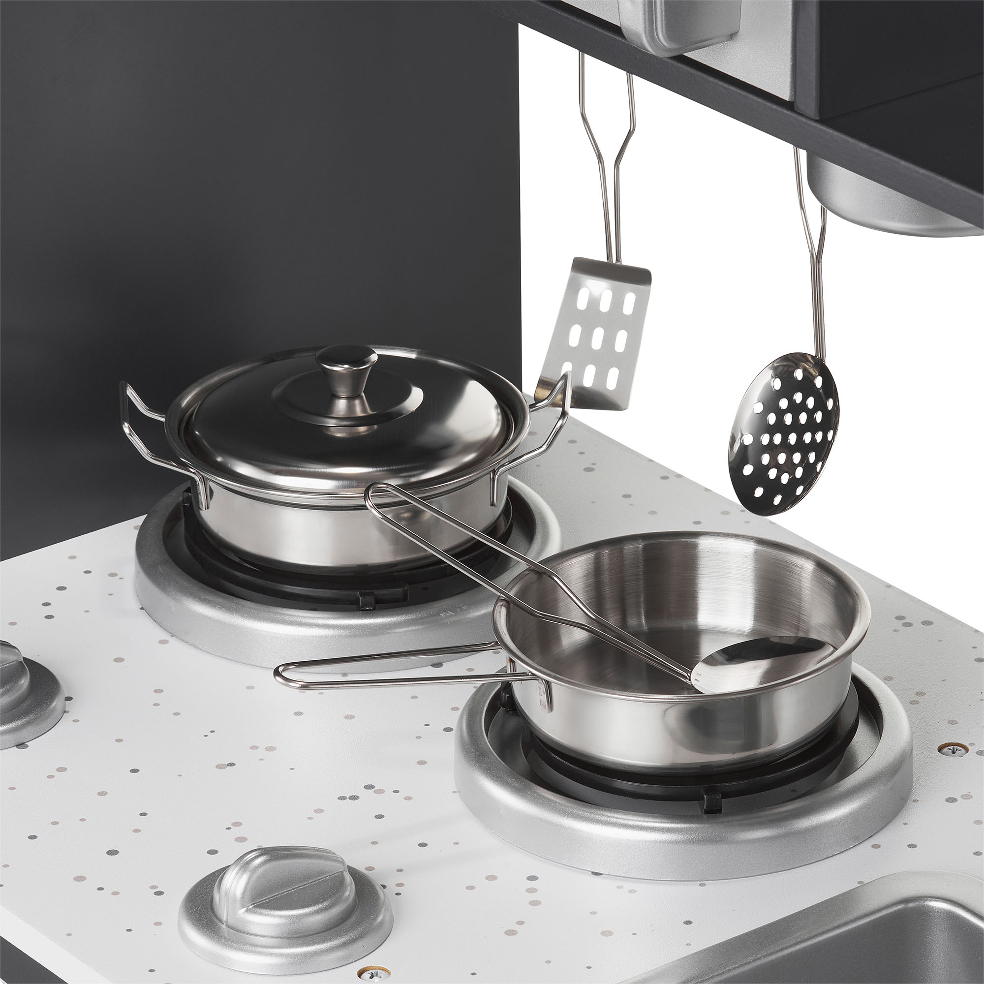 Aksesuāri, piemēram, karote, liekšķere un lāpstiņa, ir precīzi atveidoti no pieaugušo versijas. Virtuve ir izgatavota no koka.