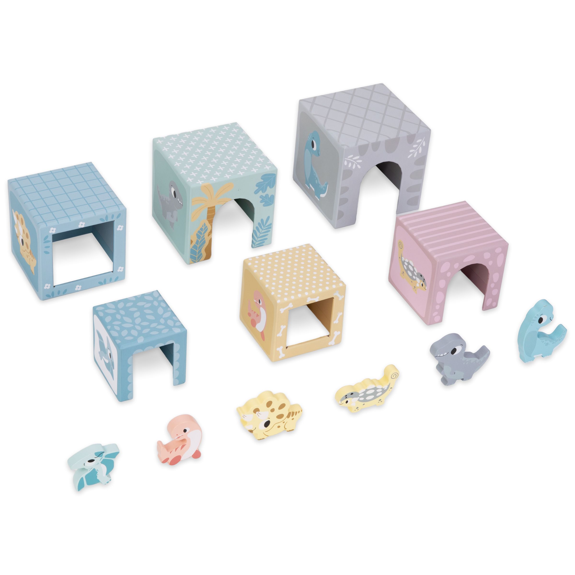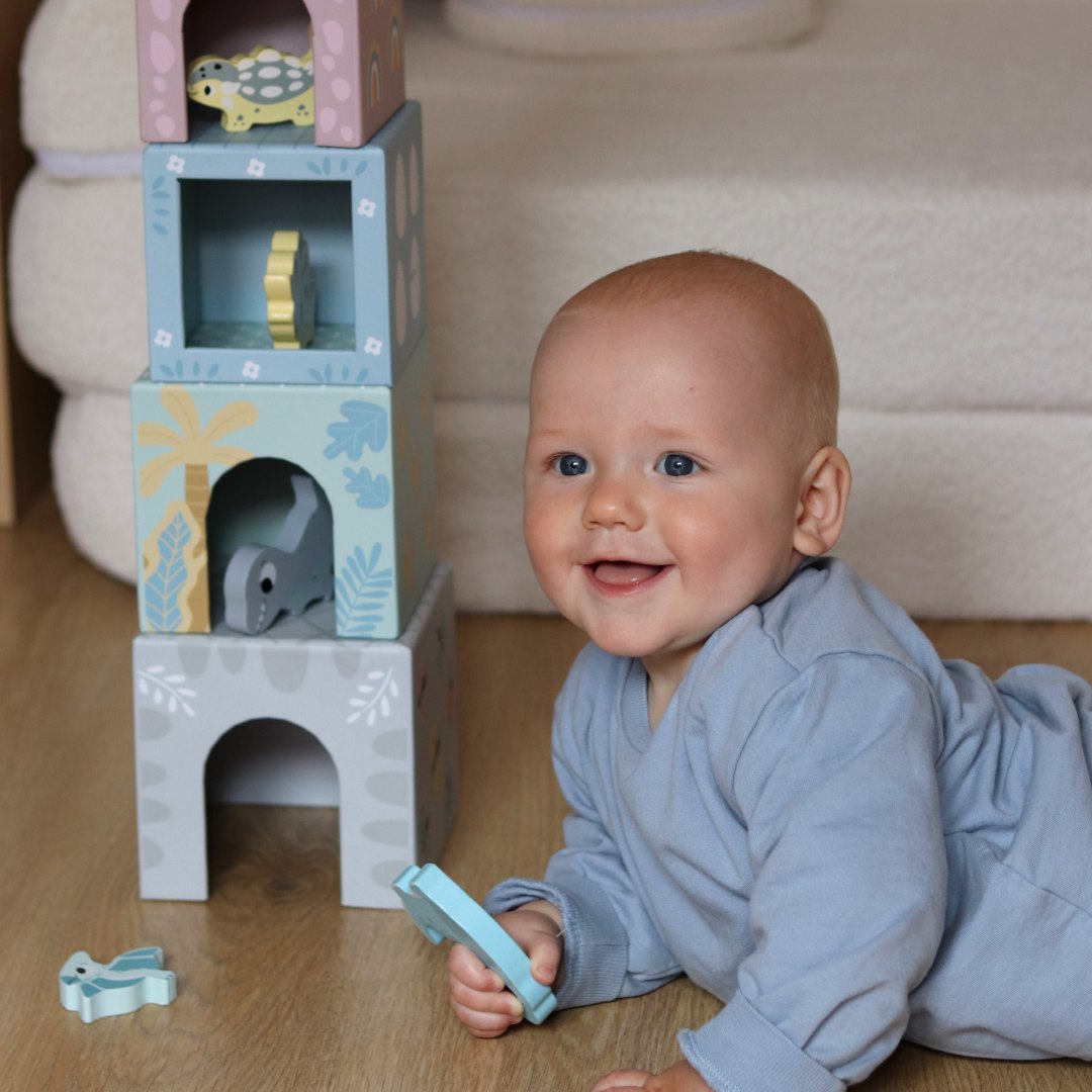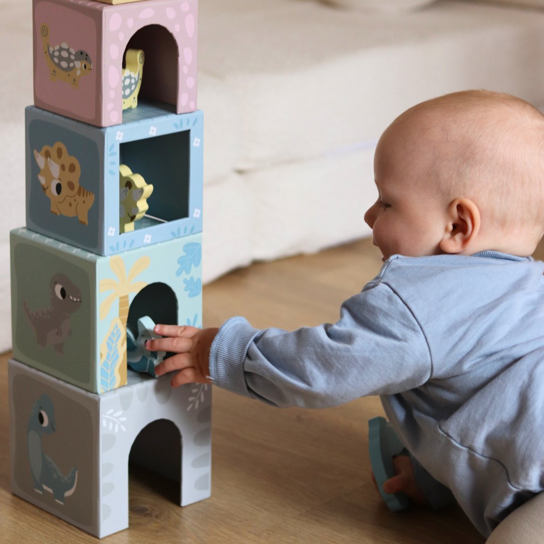 Šī rotaļlieta noteikti sniegs jūsu mazulim daudz izklaides! Viss, kas Jums jādara, ir jāuzbūvē piramīda no kartona kastēm un tad katrā kastē jāievieto atbilstošais dinozaurs. Krāsainais apdruks uz kastītēm kalpo kā pavediens jūsu bērnam. Mazulis var ne tikai būvēt torņus, bet arī izmantot rotaļlietu dažādos veidos, tādējādi attīstot savu radošumu.