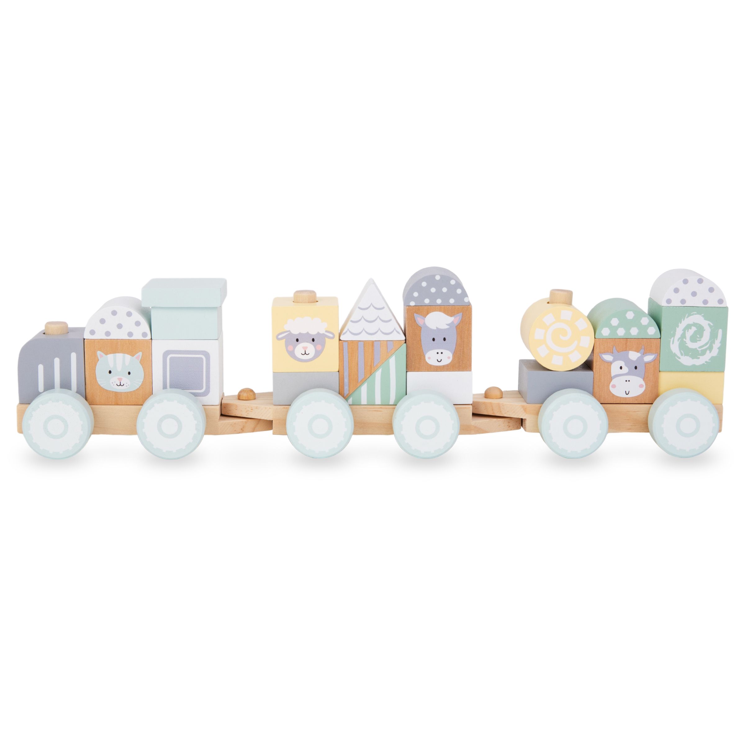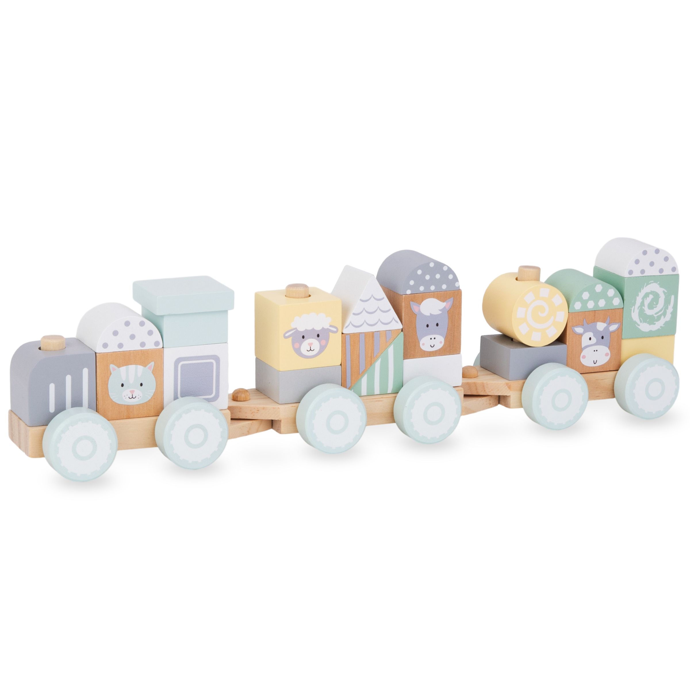 Koka, ar riteņiem aprīkotos vagonus var savienot kopā, lai izveidotu unikālu lokomotīvi. Uzliekot krāsainos klucīšus uz īpašām tapām, mazulis uzbūvē unikālu vilciena konstrukciju. Vilciens katru reizi var izskatīties citāds! Kad viss ir gatavs, ir laiks braukt. Brauciena laikā jūsu mazulis var atvienot vagonus vai mainīt klucīšu novietojumu. Lai spēli padarītu daudzveidīgāku, komplektā ir iekļauti klucīši ar mīļu lauksaimniecības dzīvnieku attēliem .